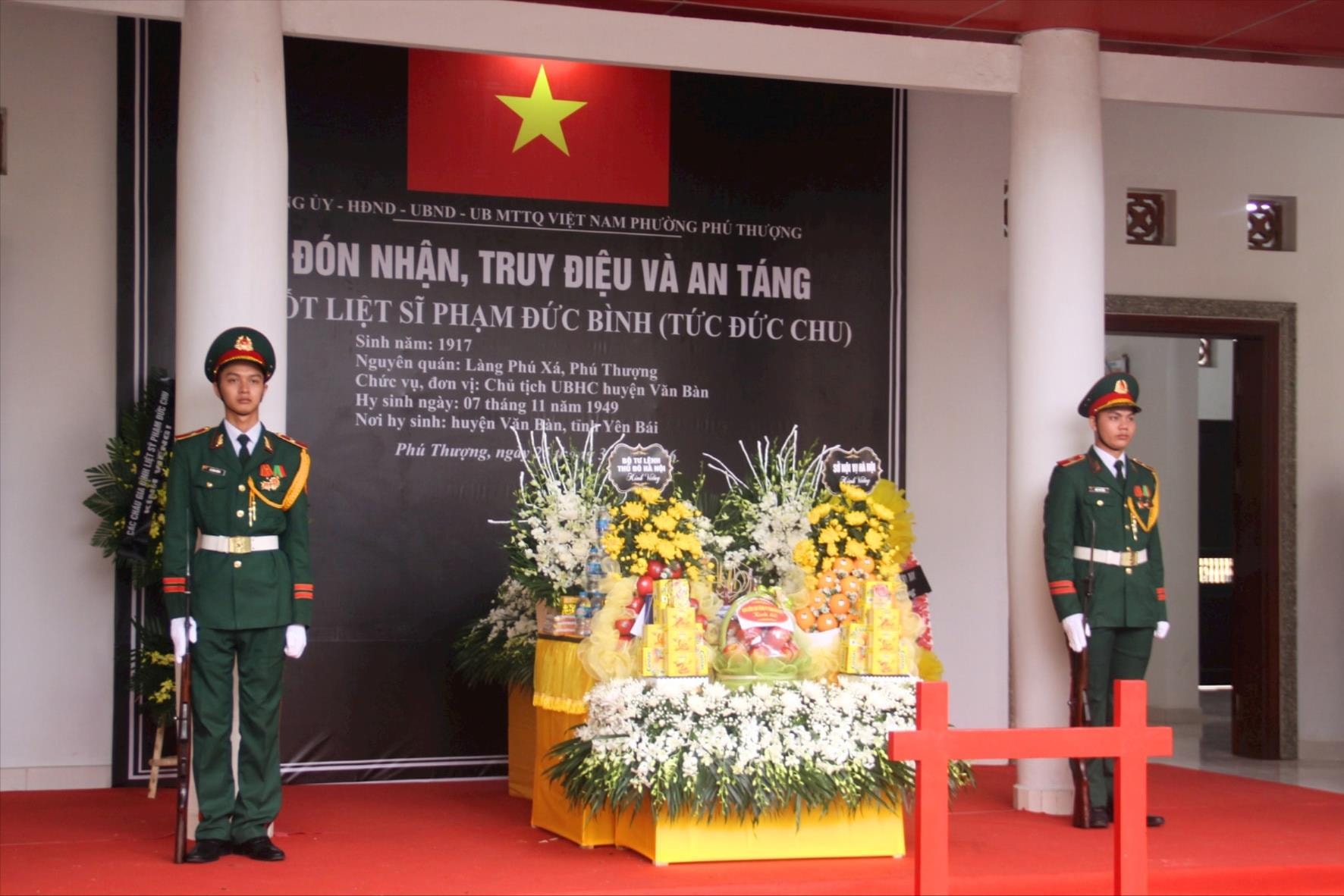 Liệt sĩ Phạm Đức Bình sinh năm 1917, quê tại làng Phú Xá, xã Phú Thượng (nay là phường Phú Thượng, thành phố Hà Nội). Sớm giác ngộ cách mạng, đồng chí tham gia lực lượng vũ trang của Trung ương, làm nhiệm vụ giao liên, góp phần bảo đảm an toàn cho các đồng chí lãnh đạo của Đảng trong những thời điểm khó khăn. Sau đó, đồng chí được giao công tác tại huyện Văn Bàn, trực tiếp tham gia xây dựng lực lượng, phát triển cơ sở trong vùng địch tạm chiếm, giữ cương vị Chủ tịch Ủy ban Hành chính kháng chiến huyện.