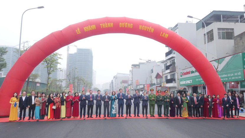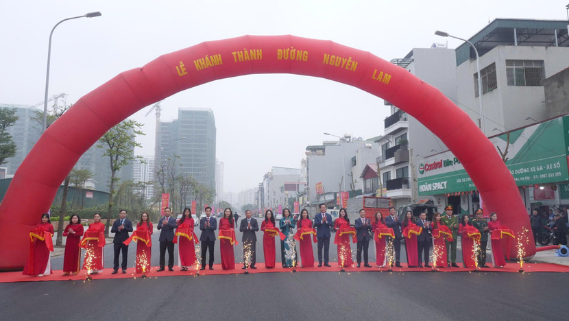 Bí thư Đảng ủy, Chủ tịch HĐND phường Phúc Lợi Nguyễn Thế Thạch, Chủ tịch UBND phường Phúc Lợi Nguyễn Thị Thanh Hằng cùng đại diện lãnh đạo phường, người dân trên địa bàn vui mừng cắt băng khánh thành tuyến phố Nguyễn Lam...
