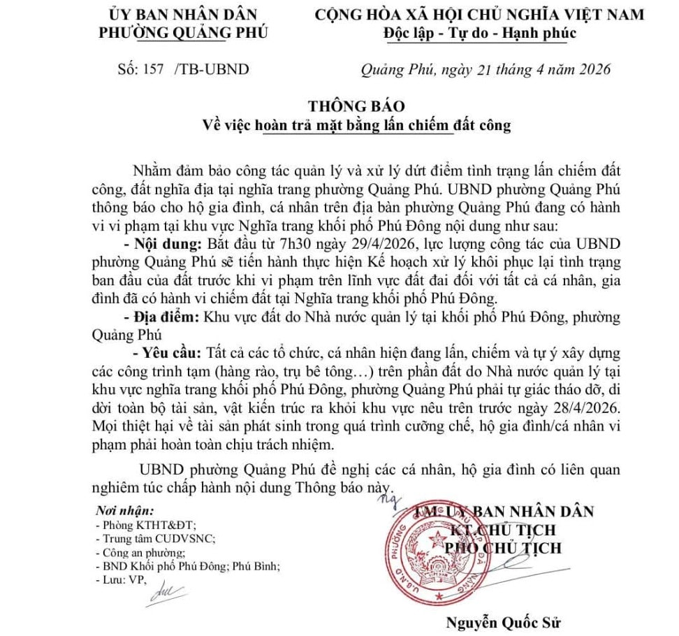 Thông báo nêu rõ: Bắt đầu từ 7 giờ 30 phút ngày 29/4/2026, lực lượng chức năng của UBND phường Quảng Phú sẽ thực hiện kế hoạch xử lý khôi phục tình trạng ban đầu của đất trước khi vi phạm trên lĩnh vực đất đai đối với tất cả cá nhân, gia đình đã có hành vi chiếm đất tại Nghĩa trang khối phố Phú Đông (thuộc khu vực đất do Nhà nước quản lý).