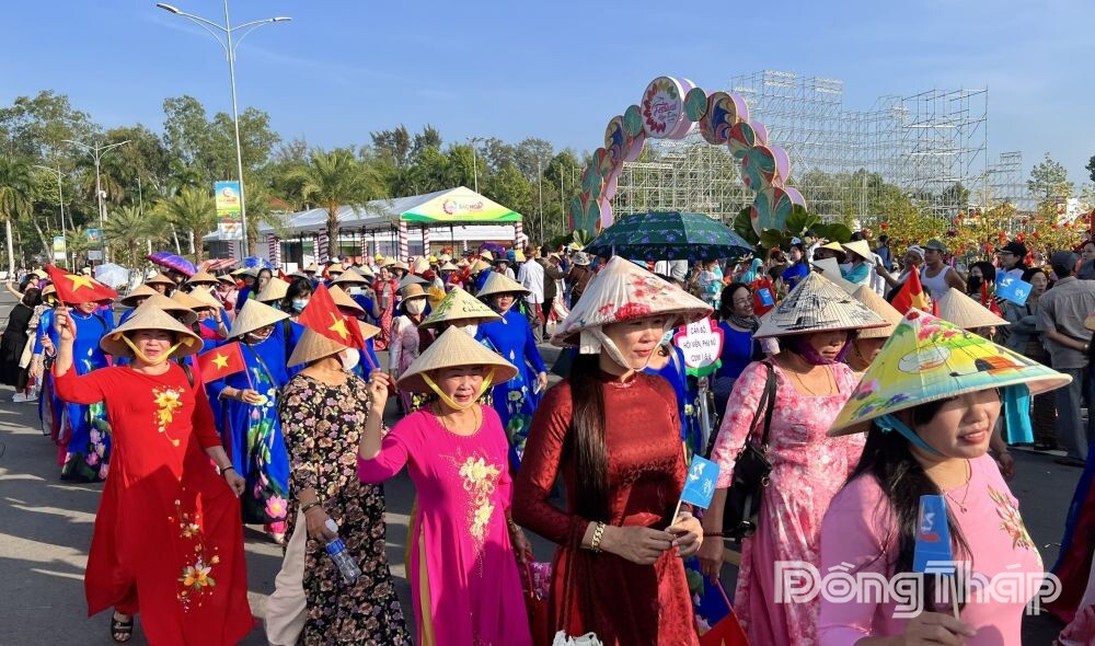 Đoàn diễu hành trong trang phục áo dài hoa truyền thống lần lượt qua các tuyến đường: Nguyễn Sinh Sắc, Nguyễn Tất Thành, Nguyễn Cư Trinh thuộc phường Sa Đéc.