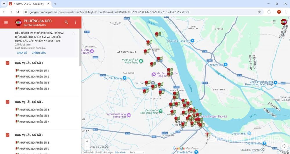 Bản đồ số hiển thị đầy đủ và chi tiết thông tin của 37 khu vực bỏ phiếu thuộc 10 đơn vị bầu cử trên toàn địa bàn phường Sa Đéc.