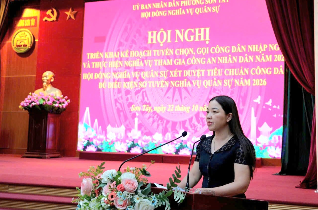 Phát biểu tại hội nghị, Chủ tịch UBND phường, Chủ tịch Hội đồng Nghĩa vụ quân sự phường Sơn Tây Nguyễn Thị Thu Hương nhấn mạnh, công tác tuyển chọn, gọi công dân nhập ngũ, tuyển chọn công dân tham gia nghĩa vụ Công an nhân dân hằng năm là nhiệm vụ chính trị trọng tâm, thường xuyên của địa phương; thể hiện lòng yêu nước, ý thức trách nhiệm và nghĩa vụ thiêng liêng của mỗi công dân với Tổ quốc.