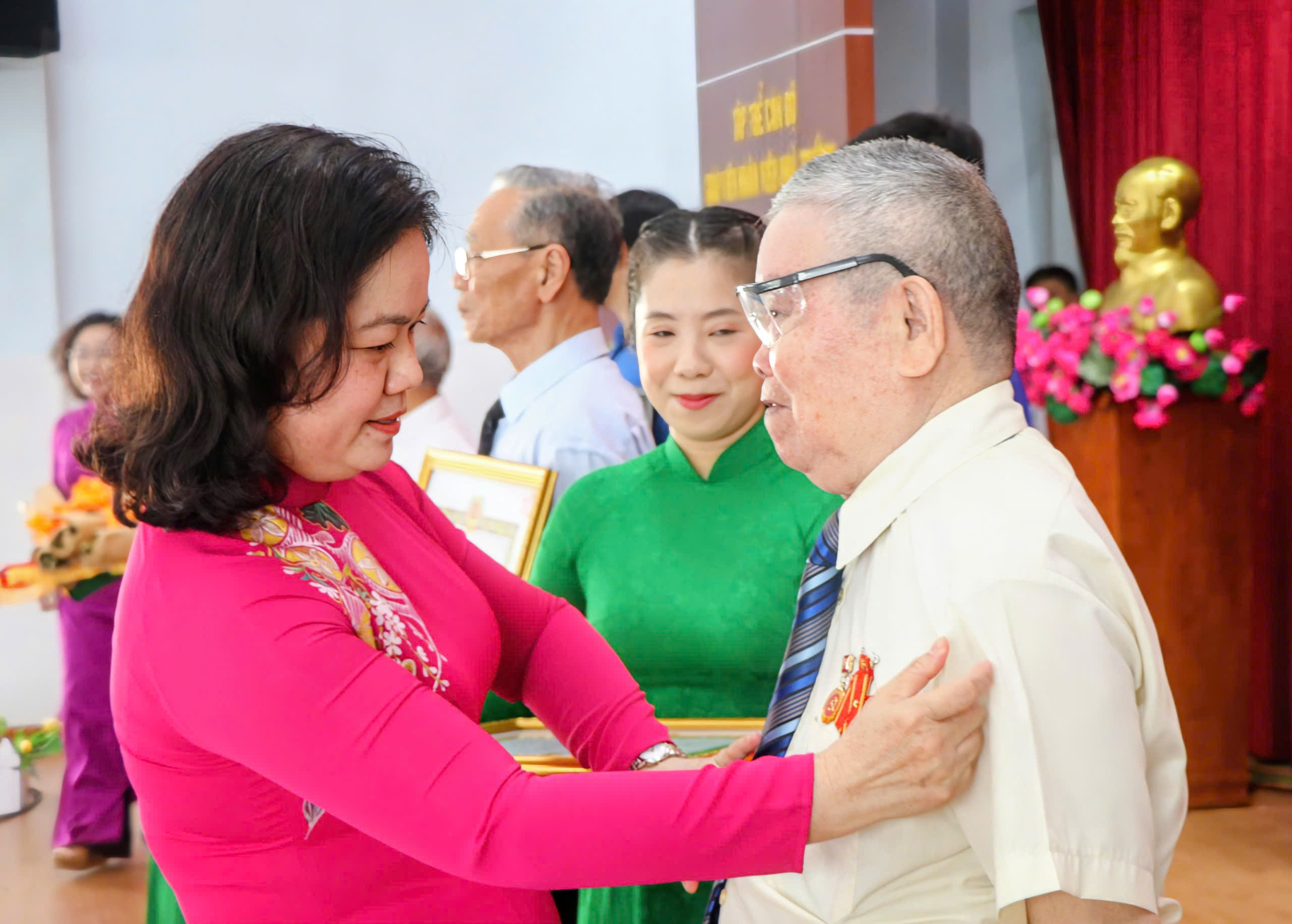 Trưởng Ban Nội chính Thành ủy TPHCM Nguyễn Thị Mỹ Hằng và Bí thư Đảng ủy phường Hàng Thị Thu Nga trao Huy hiệu 60 năm tuổi Đảng