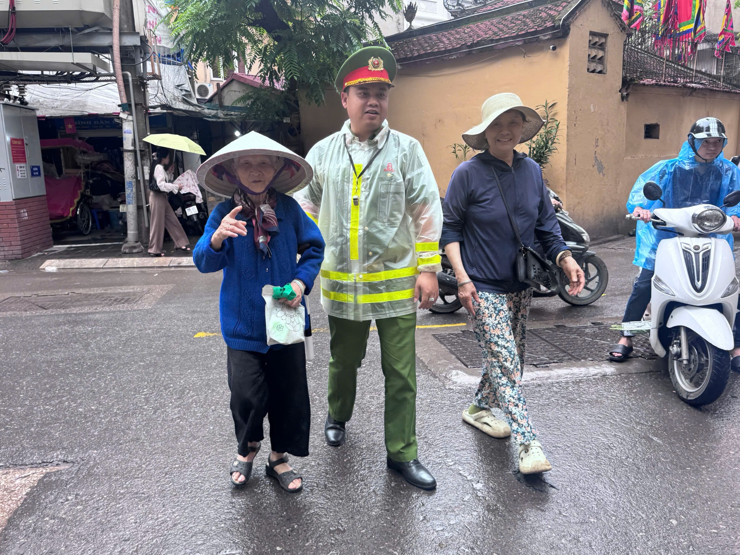 Công an phường Tây Hồ hỗ trợ người cao tuổi qua đường. Ảnh: PV