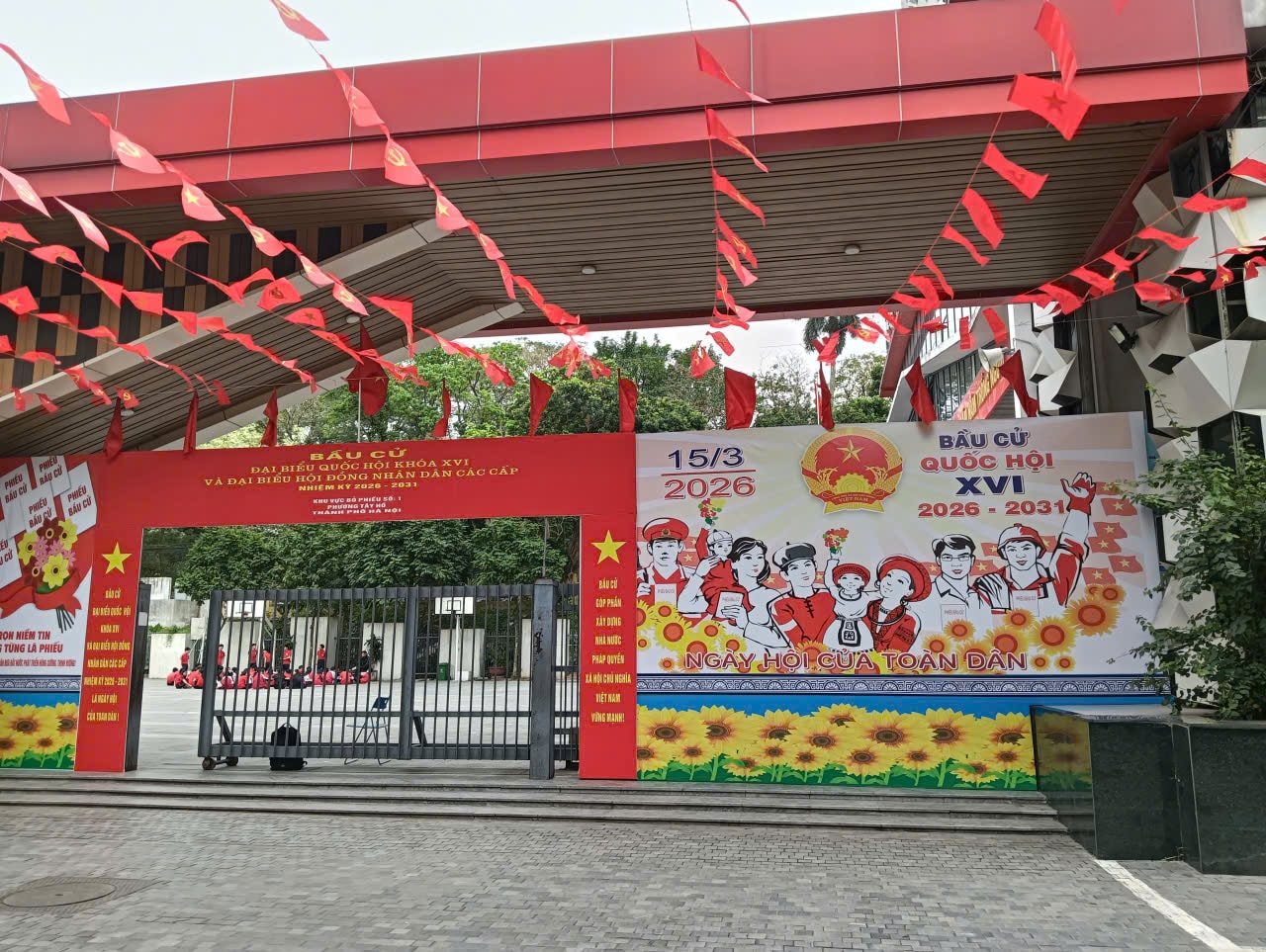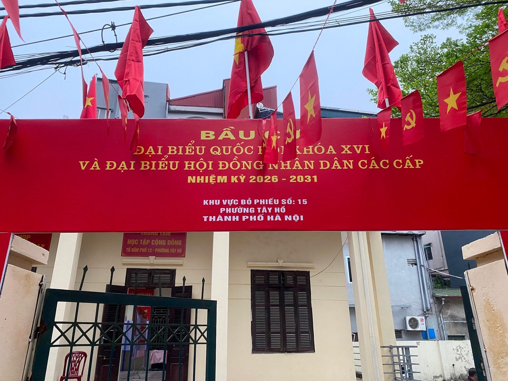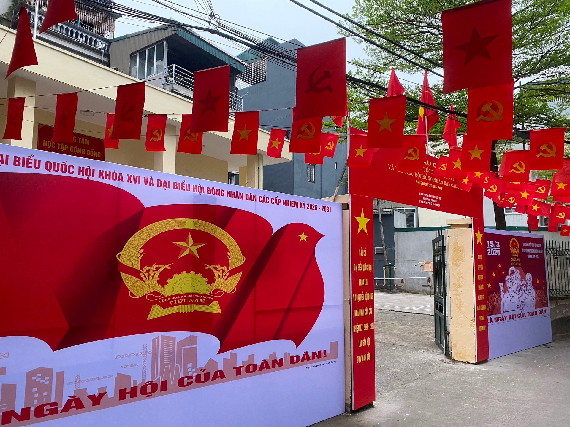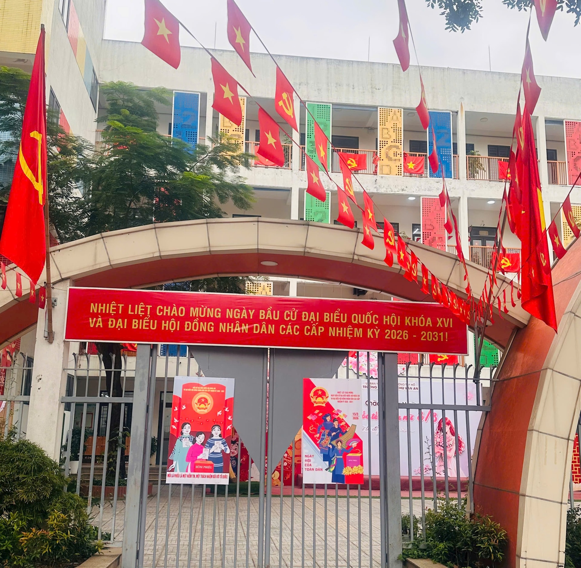 Các cơ quan, công sở tại phường Tây Hồ được trang hoàng rực rỡ để phục vụ ngày bầu cử 15-3. Ảnh: Hà Phương