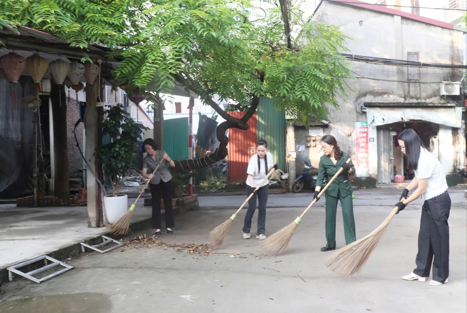 Cán bộ, hội viên các tổ chức, đoàn thể phường Tây Tựu tham gia "Ngày Chủ nhật xanh". Ảnh: DK
