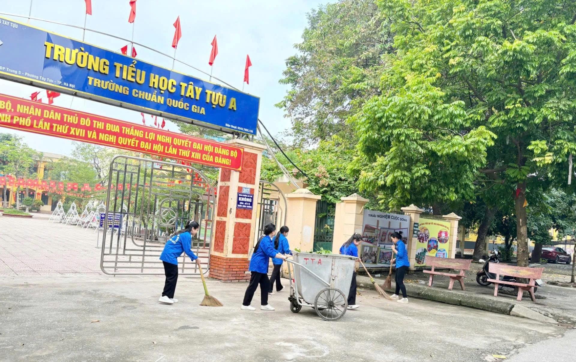 Đoàn viên, thanh niên phường Tây Tựu vệ sinh môi trường trước cổng Trường Tiểu học Tây Tựu A. Ảnh: DK