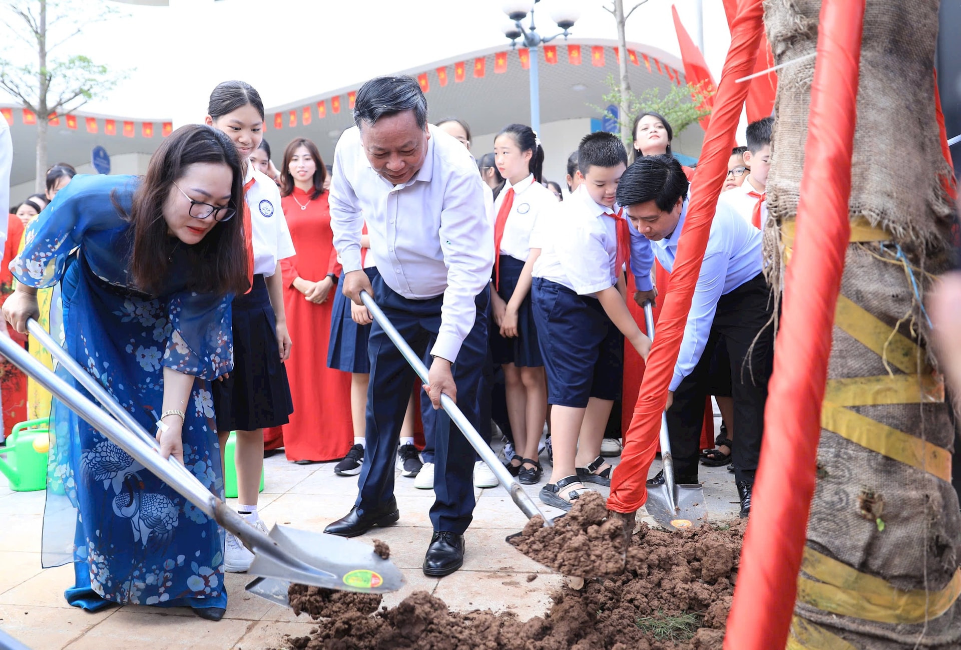 Phó Bí thư Thường trực Thành ủy Hà Nội Nguyễn Văn Phong và các đại biểu trồng cây xanh tại Trường Trung học cơ sở Bắc Từ Liêm. Ảnh: Quang Thái