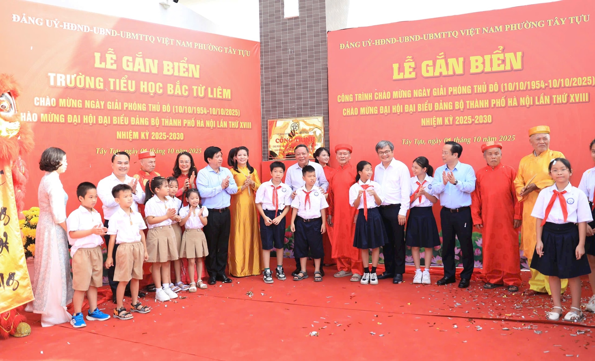 Phó Bí thư Thường trực Thành ủy Hà Nội Nguyễn Văn Phong và các đại biểu tại lễ gắn biển công trình Trường Tiểu học Bắc Từ Liêm. Ảnh: Quang Thái