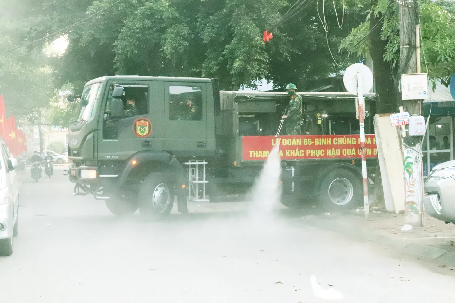 Cán bộ, chiến sĩ Đại đội 66, Lữ đoàn 86, Binh chủng hóa học, Bộ quốc phòng phối hợp tham gia phun khử khuẩn trên địa bàn phường Tây Tựu.