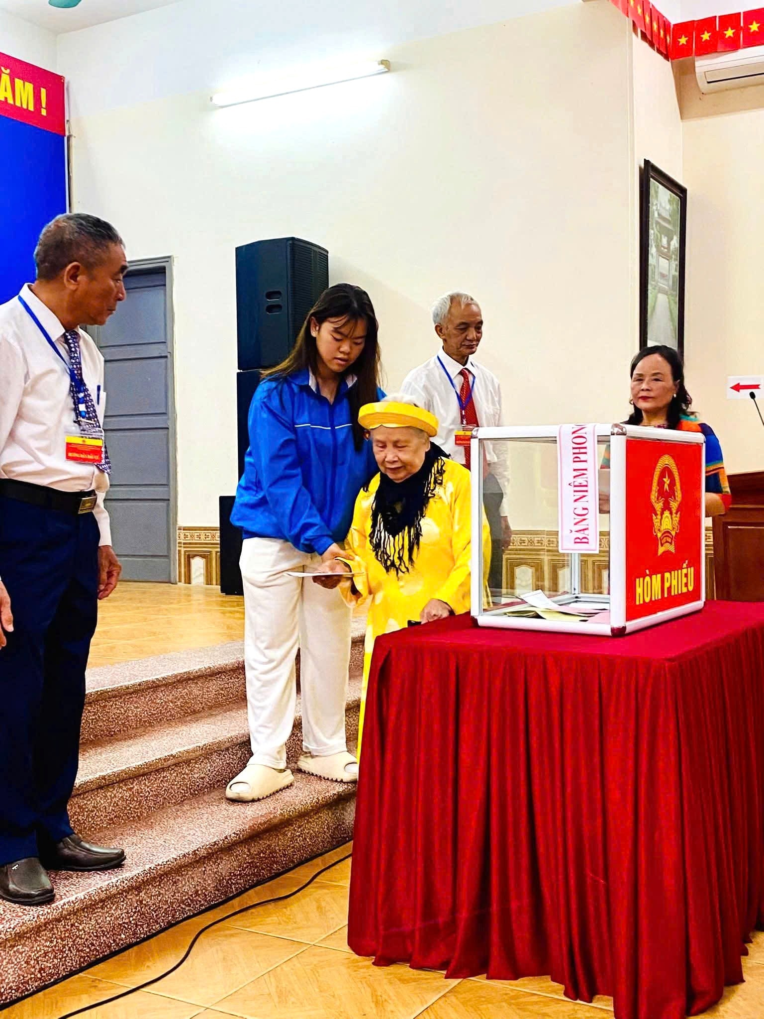 Để hỗ trợ cử tri, đặc biệt là người cao tuổi hoặc những người gặp khó khăn trong việc đi lại, các tổ bầu cử đã bố trí lực lượng thanh niên tình nguyện tại điểm bỏ phiếu. Các đoàn viên thanh niên tích cực hỗ trợ, hướng dẫn từng cử tri từ khâu nhận phiếu, ghi phiếu đến bỏ phiếu, góp phần giúp quá trình bỏ phiếu diễn ra nhanh chóng, thuận lợi.
