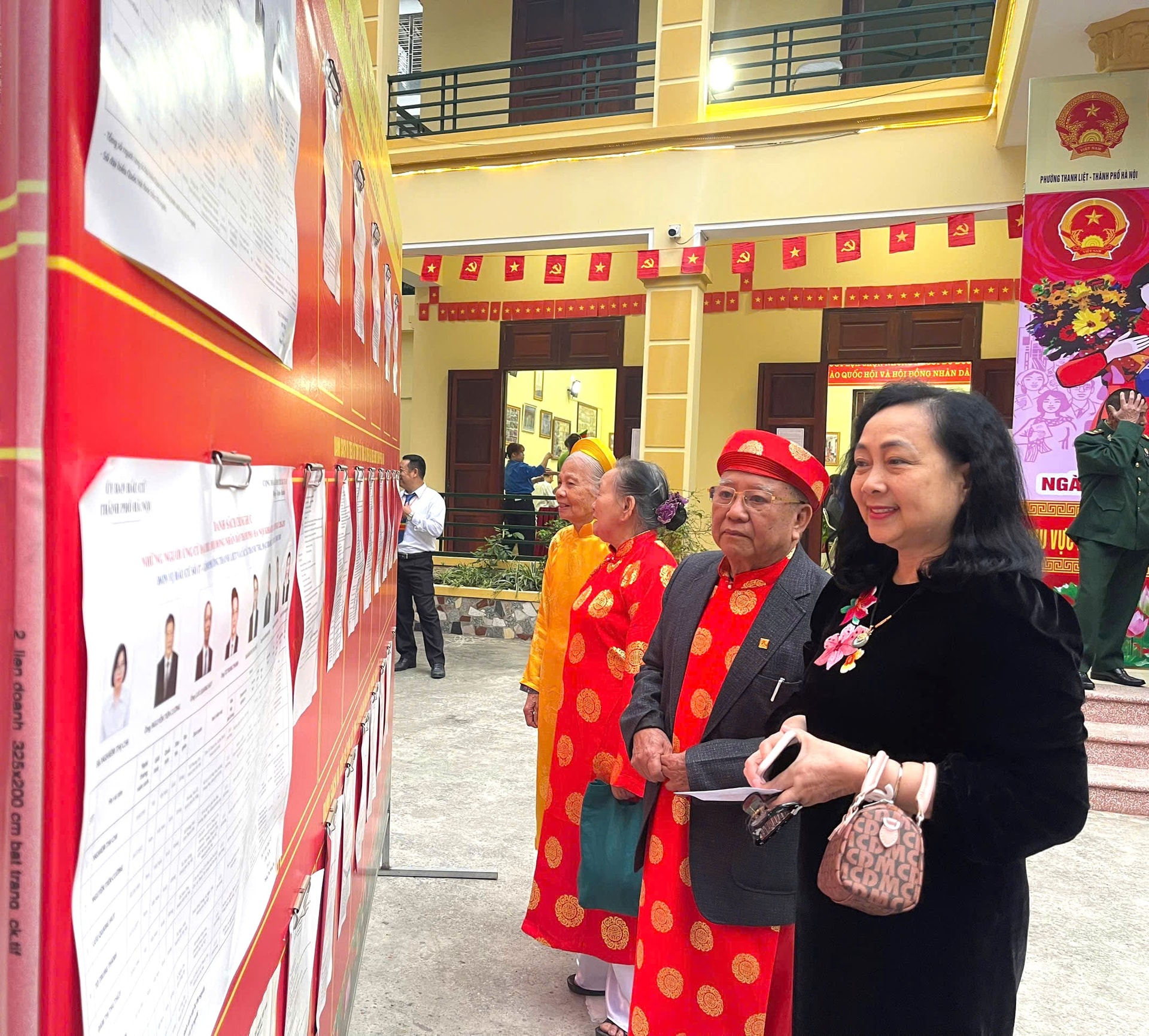 Các cử tri tại khu vực bỏ phiếu số 1 xem lại thông tin trên bảng niêm yết. Ảnh: Đào Tuyết