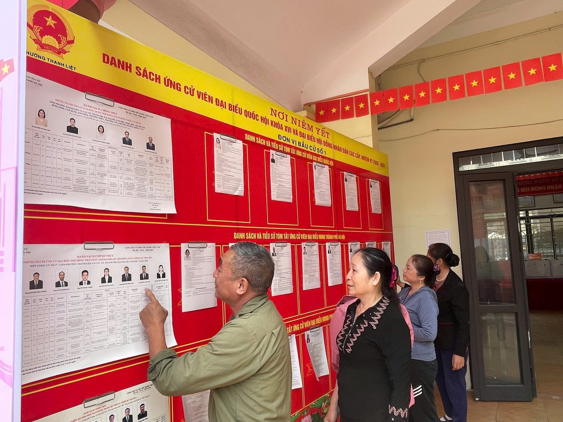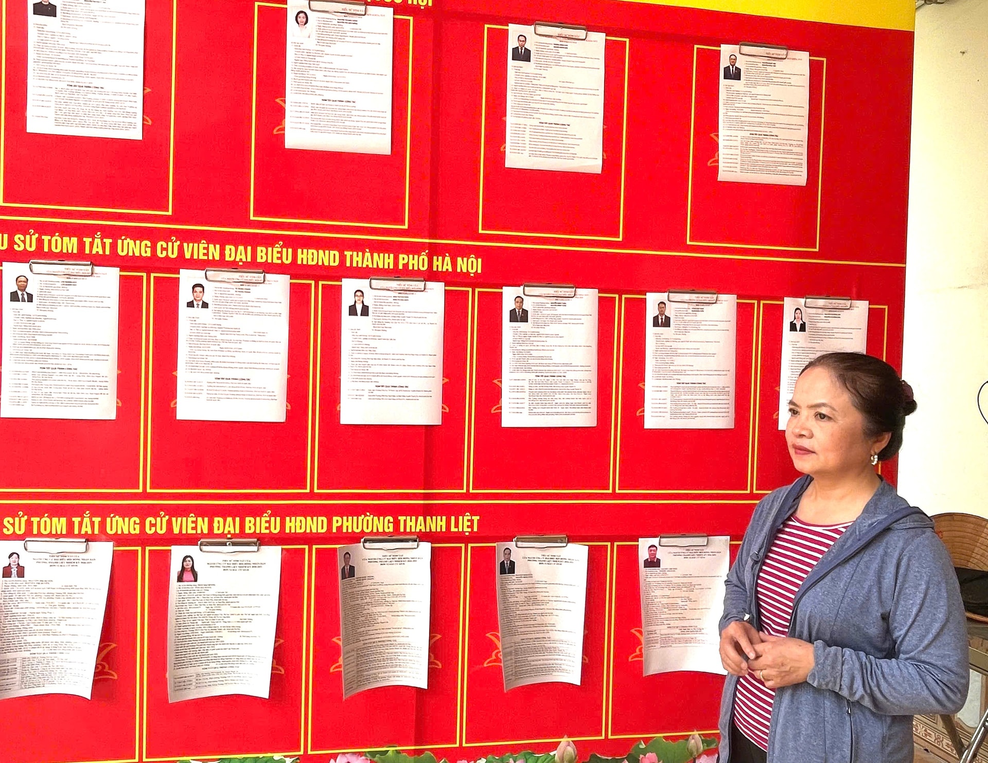 Các cử tri xem tiểu sử tóm tắt của ứng cử viên đại biểu Quốc hội tại Đơn vị bầu cử số 1 phường Thanh Liệt. Ảnh: Đào Tuyết