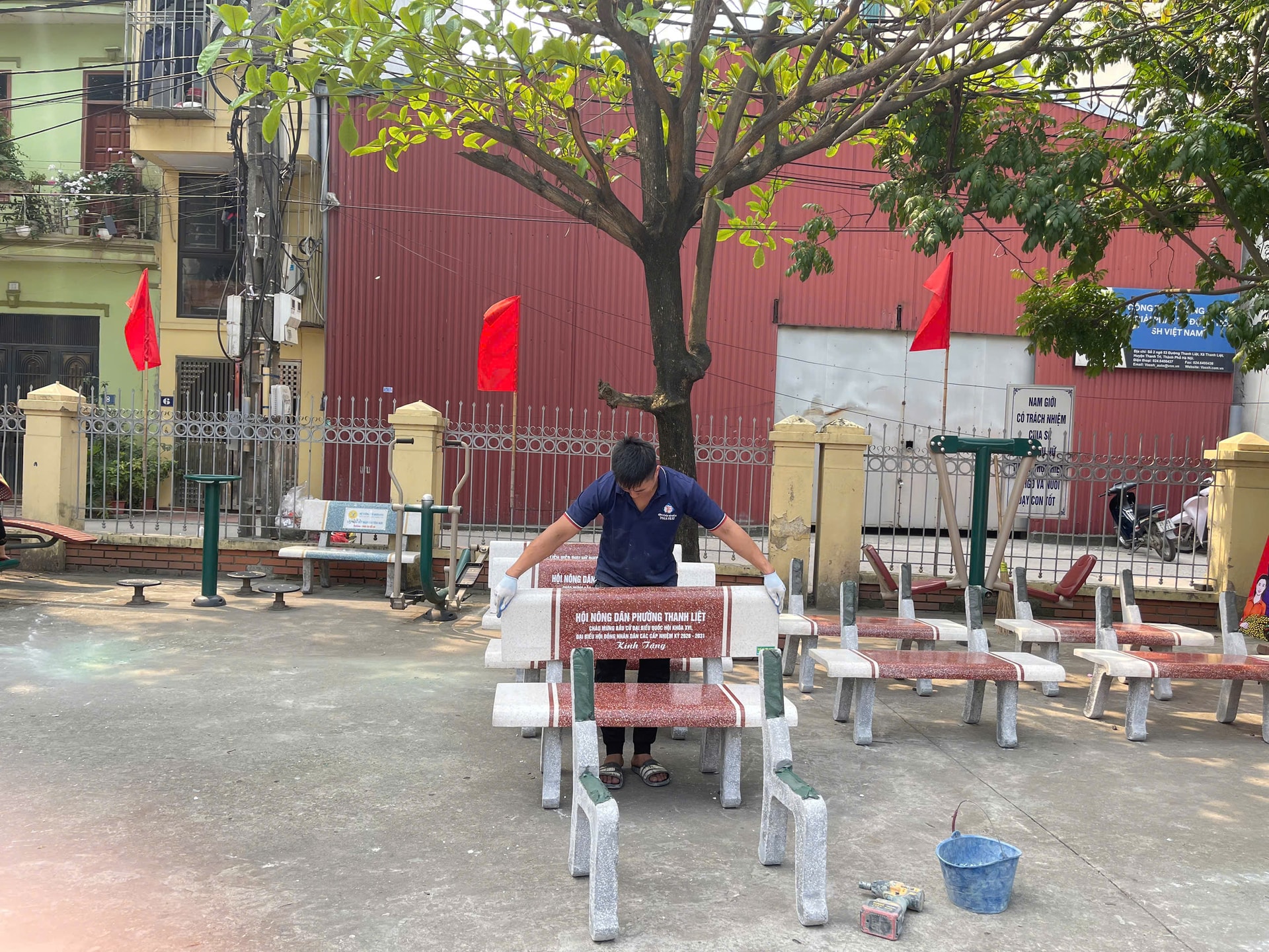 Lắp ghế đá mới phục vụ cho các cử tri đi bầu cử tại tổ bầu cử số 2. Ảnh: Đào Tuyết