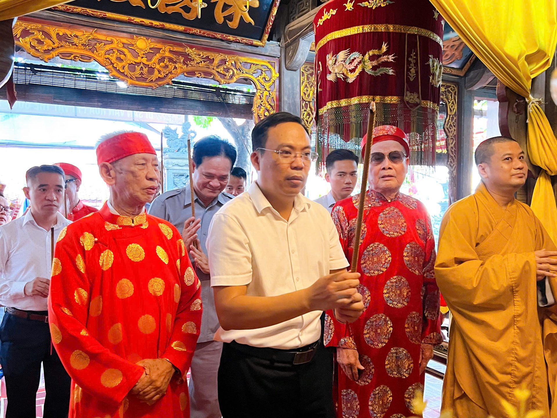 Các đồng chí lãnh đạo thành phố, phường Thanh Liệt, cùng cán bộ, đảng viên và nhân dân thành kính dâng hương tưởng niệm Đức Thánh Phùng Hưng. Ảnh: Nghiêm Liên.