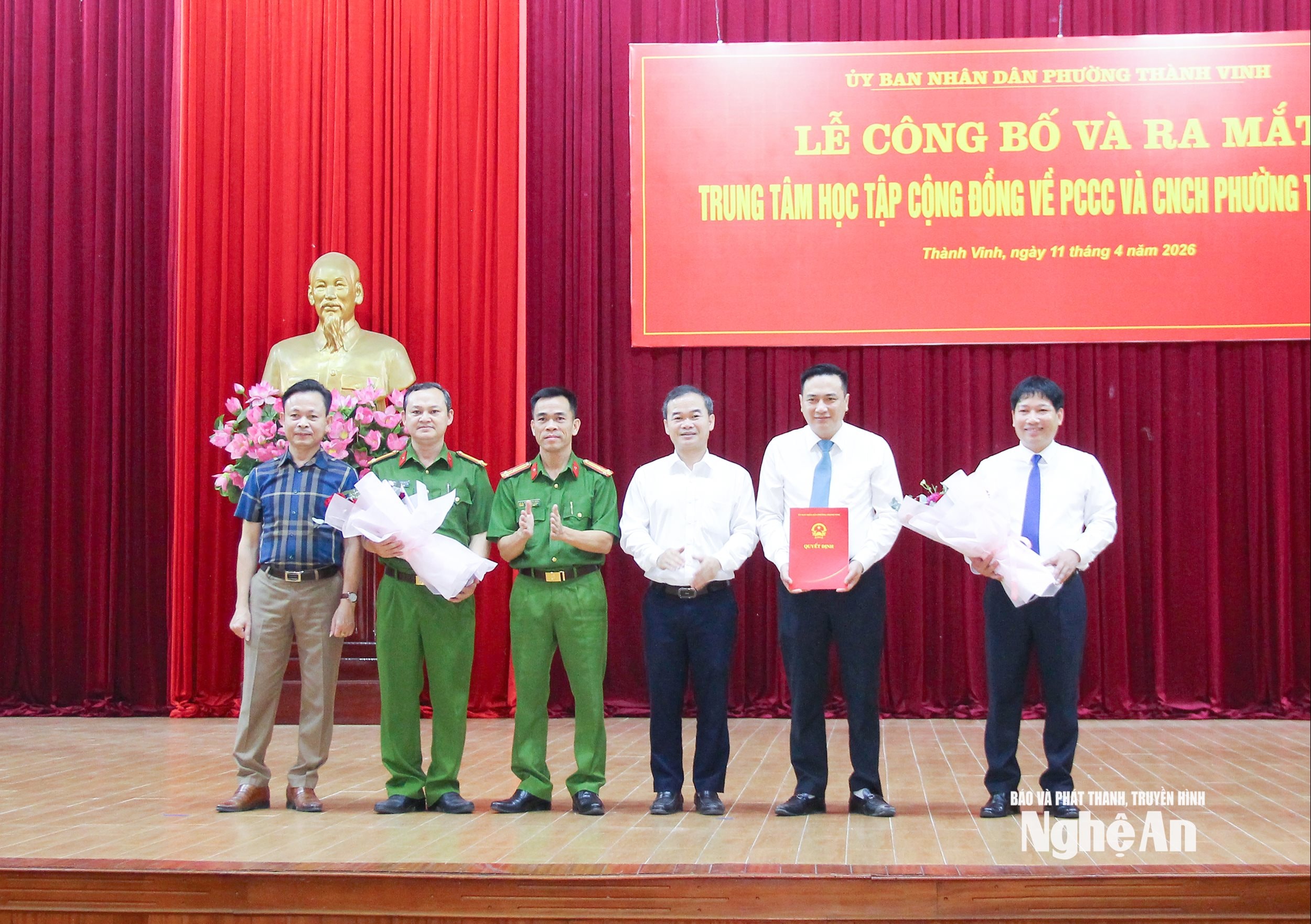 Lãnh đạo Phòng Cảnh sát phòng cháy, chữa cháy và cứu nạn, cứu hộ, Công an tỉnh và phường Thành Vinh trao Quyết định thành lập Trung tâm Học tập cộng đồng phường Thành Vinh. Ảnh: Mai Hoa