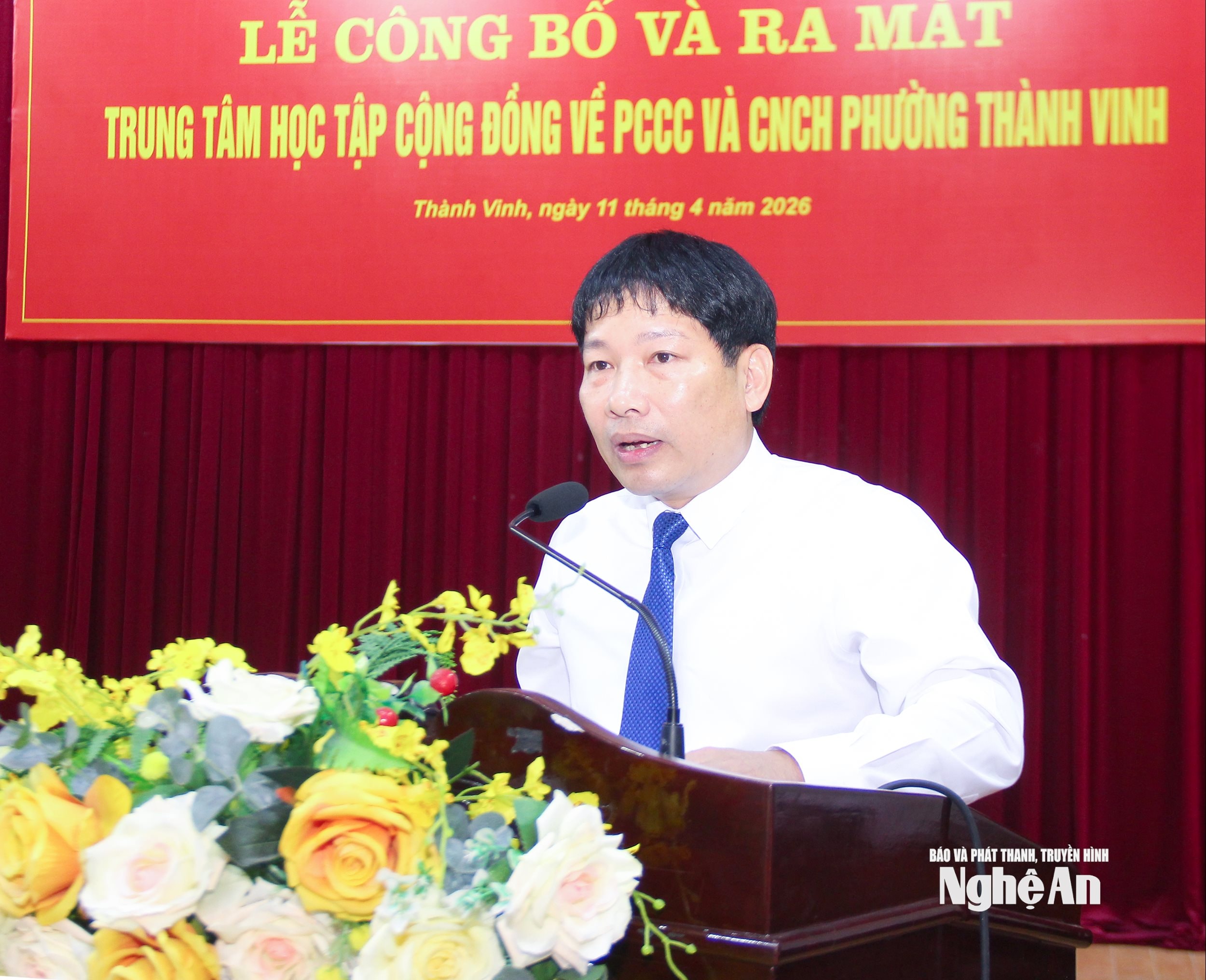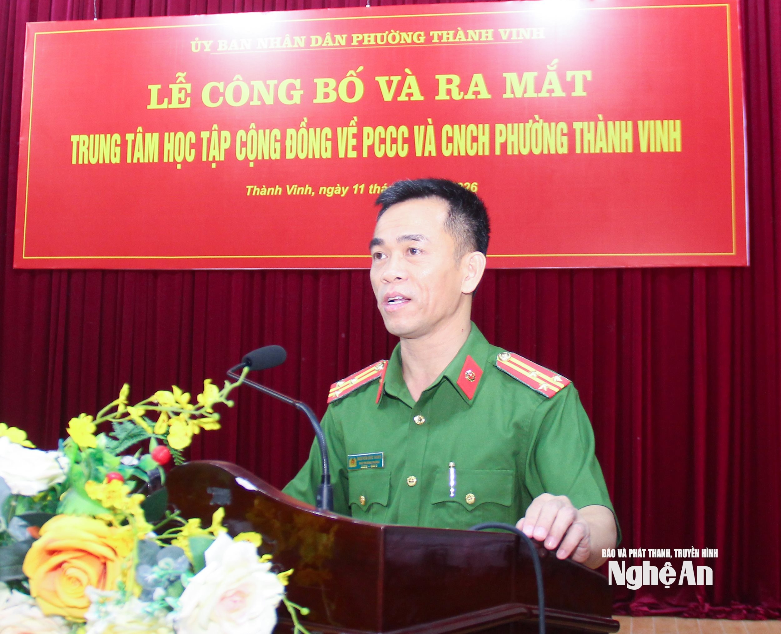 Thượng tá Nguyễn Đức Hùng - Phó Trưởng phòng Cảnh sát phòng cháy chữa cháy và cứu nạn, cứu hộ, Công an tỉnh phát biểu tại lễ ra mắt Trung tâm Học tập cộng đồng phường Thành Vinh. Ảnh: Mai Hoa