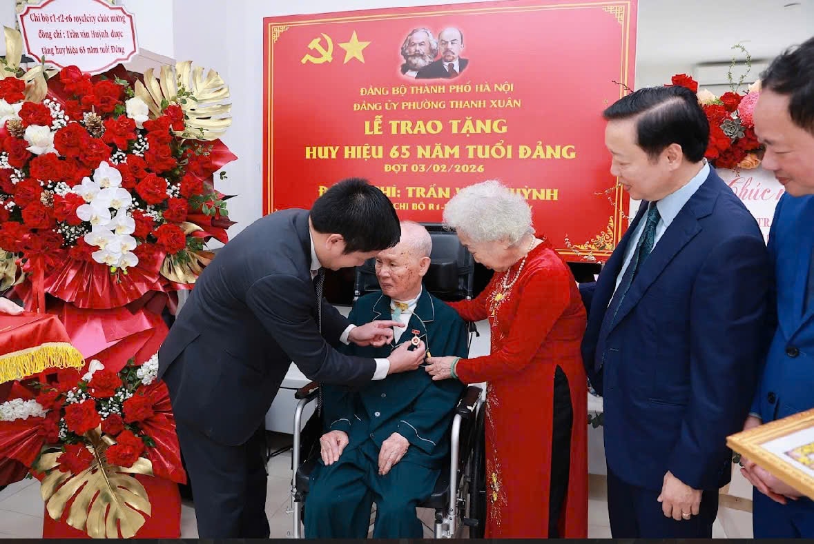 Lãnh đạo phường Thanh Xuân trao Huy hiệu 65 năm tuổi Đảng tặng đảng viên Trần Văn Huỳnh. Ảnh: Minh Hiền