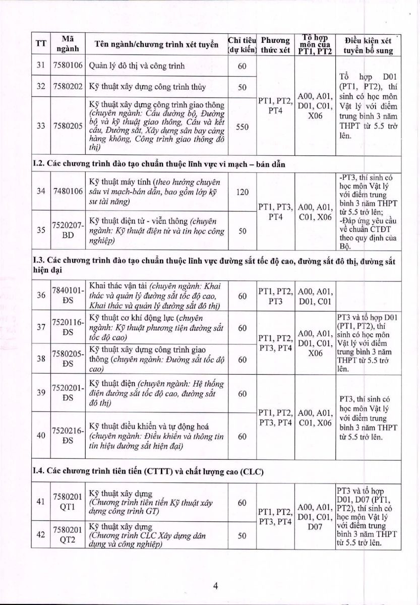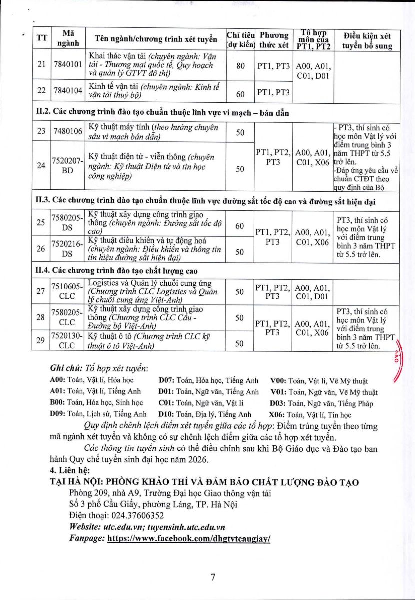 Trường Đại học Giao thông vận tải thông báo phương thức tuyển sinh 2026 bao gồm phương thức xét tuyển, tổ hợp môn xét tuyển và dự kiến chỉ tiêu tuyển sinh đại học hệ chính quy năm 2026.