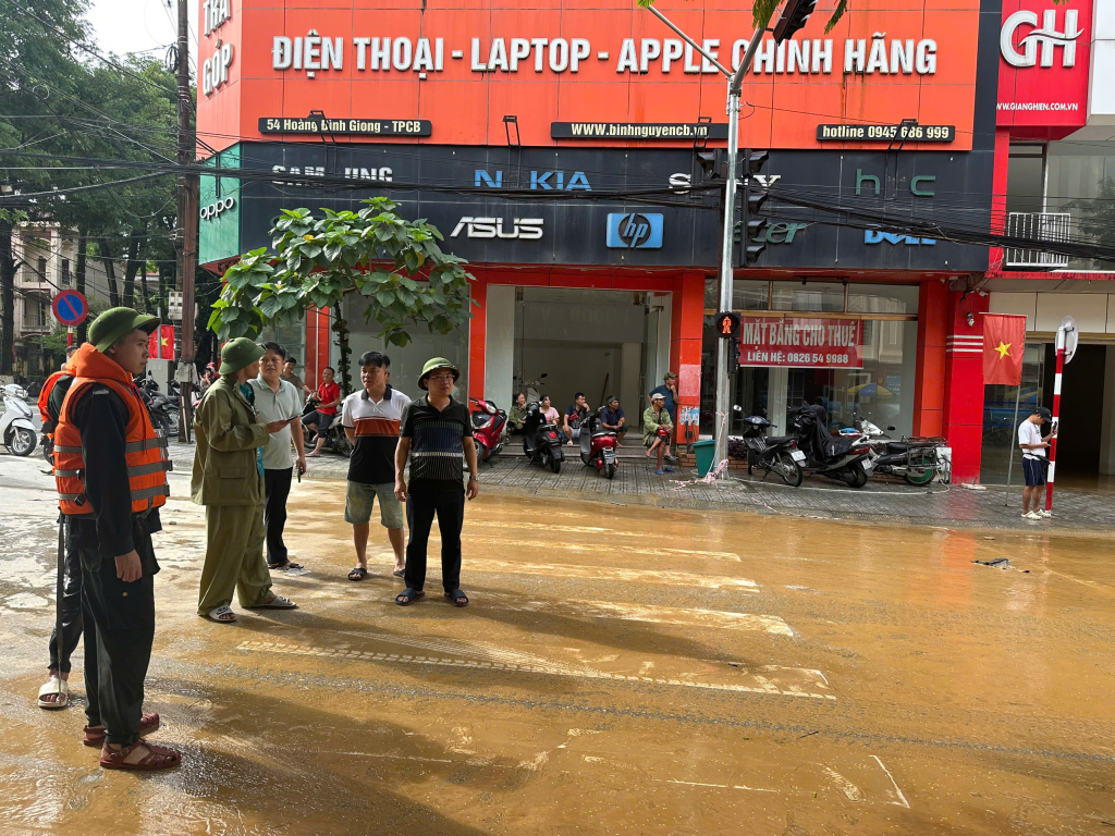 Nhiều khu vực phường Thục Phán bị nước ngập cao, lực lượng cứu hộ khó tiếp cận.