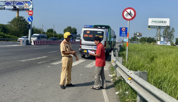CSGT xử lý xe khách vi phạm trên đường dẫn vào cao tốc.