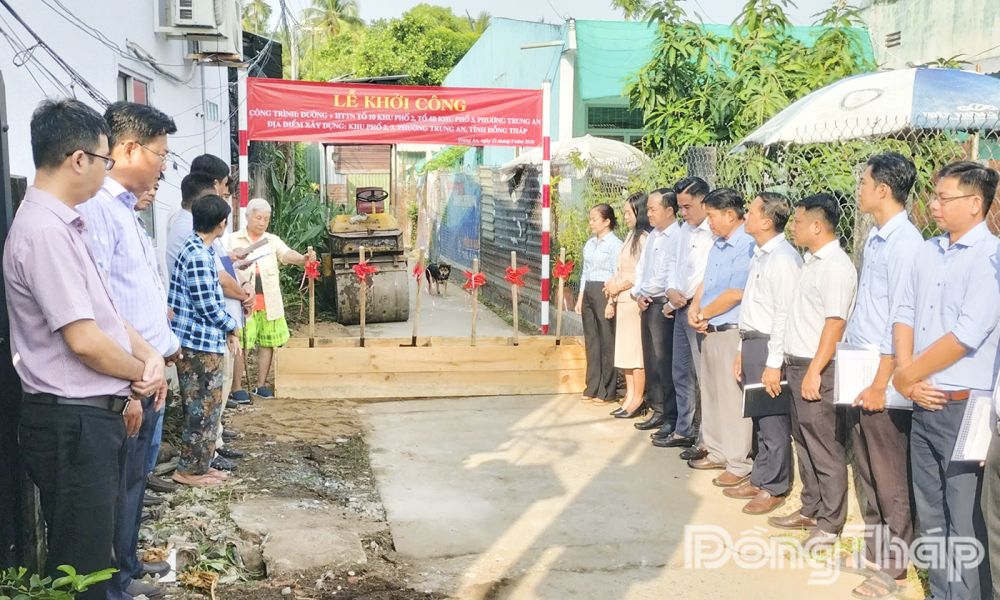Lãnh đạo phường Trung An thực hiện nghi thức khởi công công trình đường giao thông tại khu phố Long Hưng.