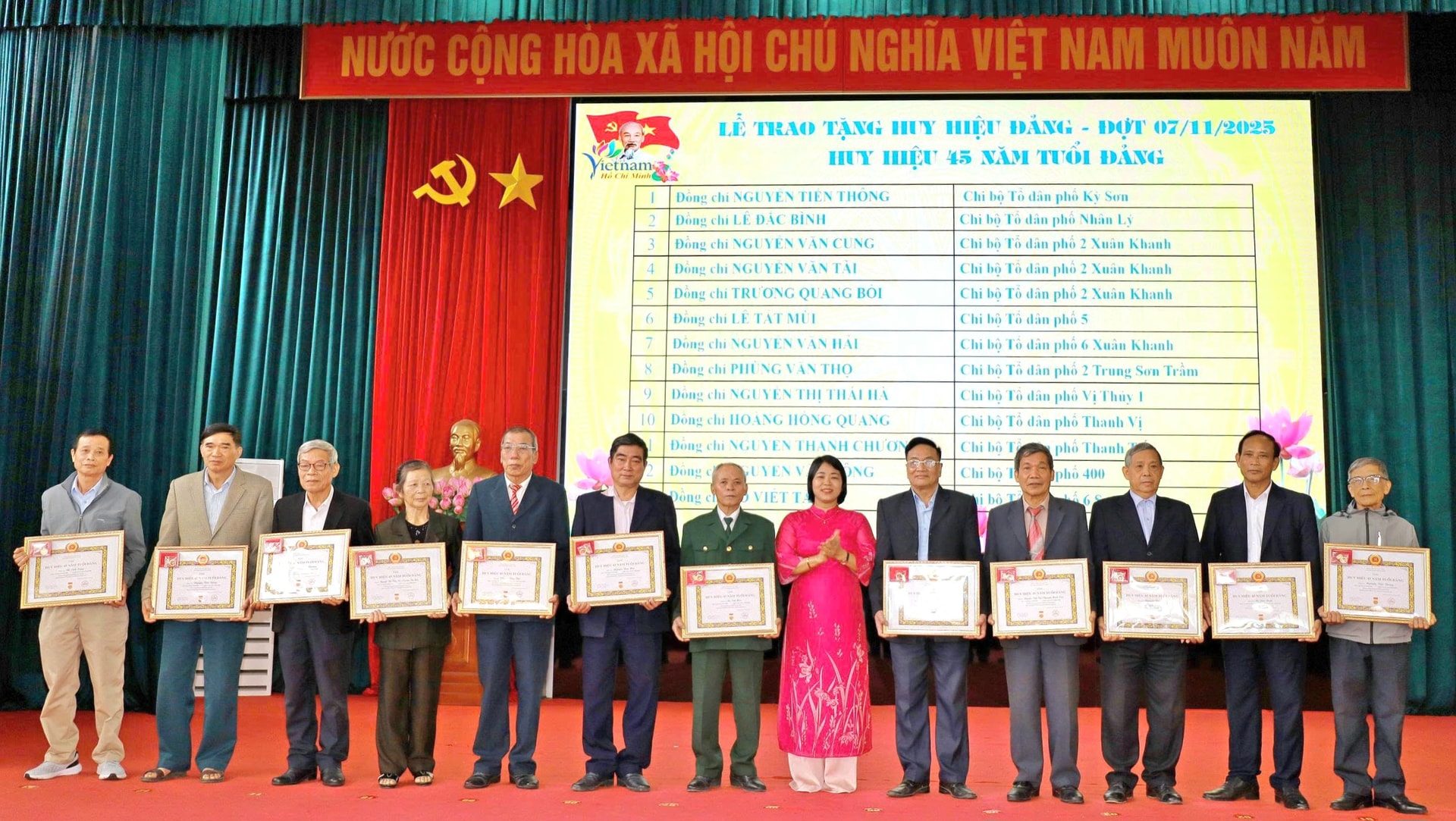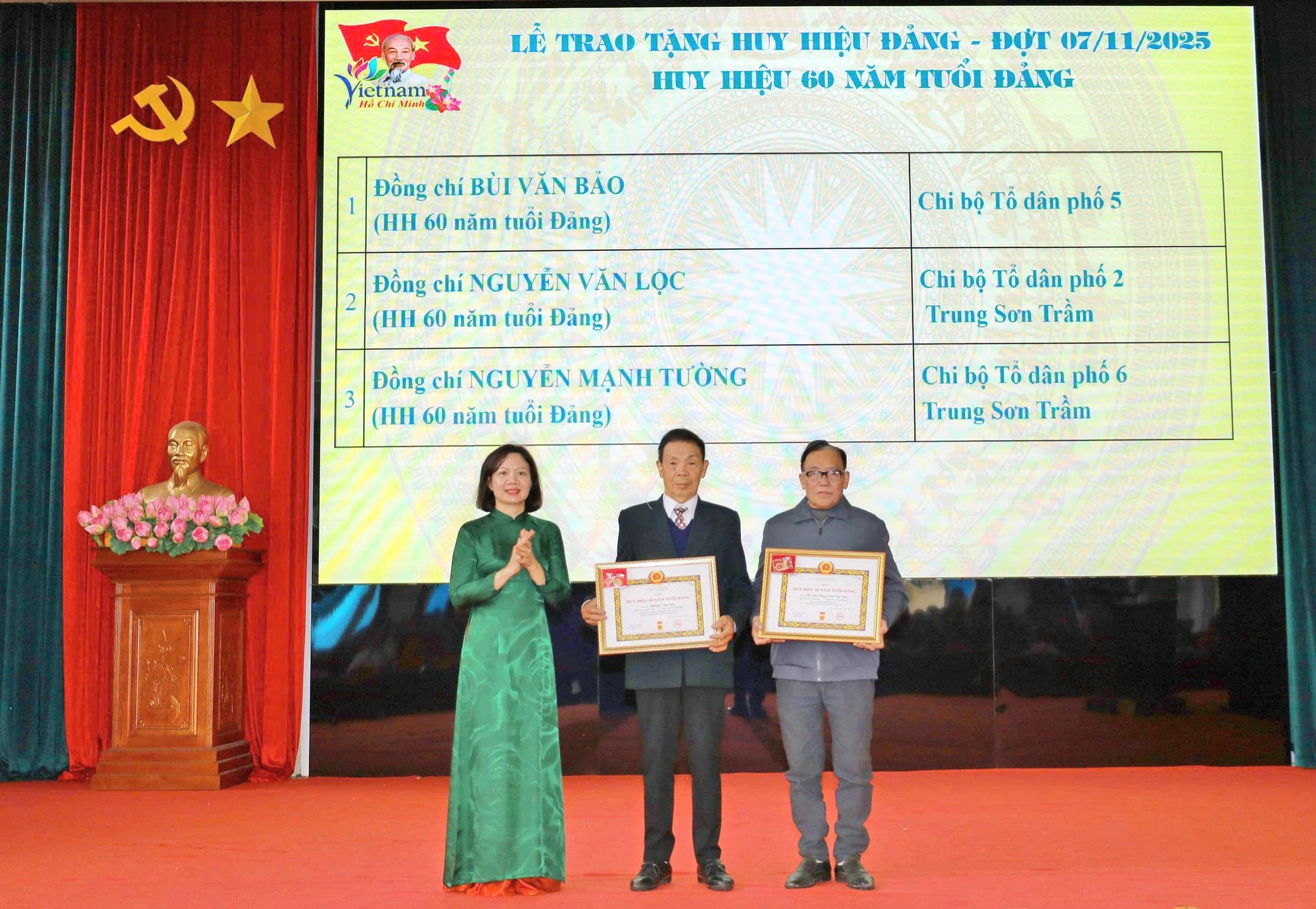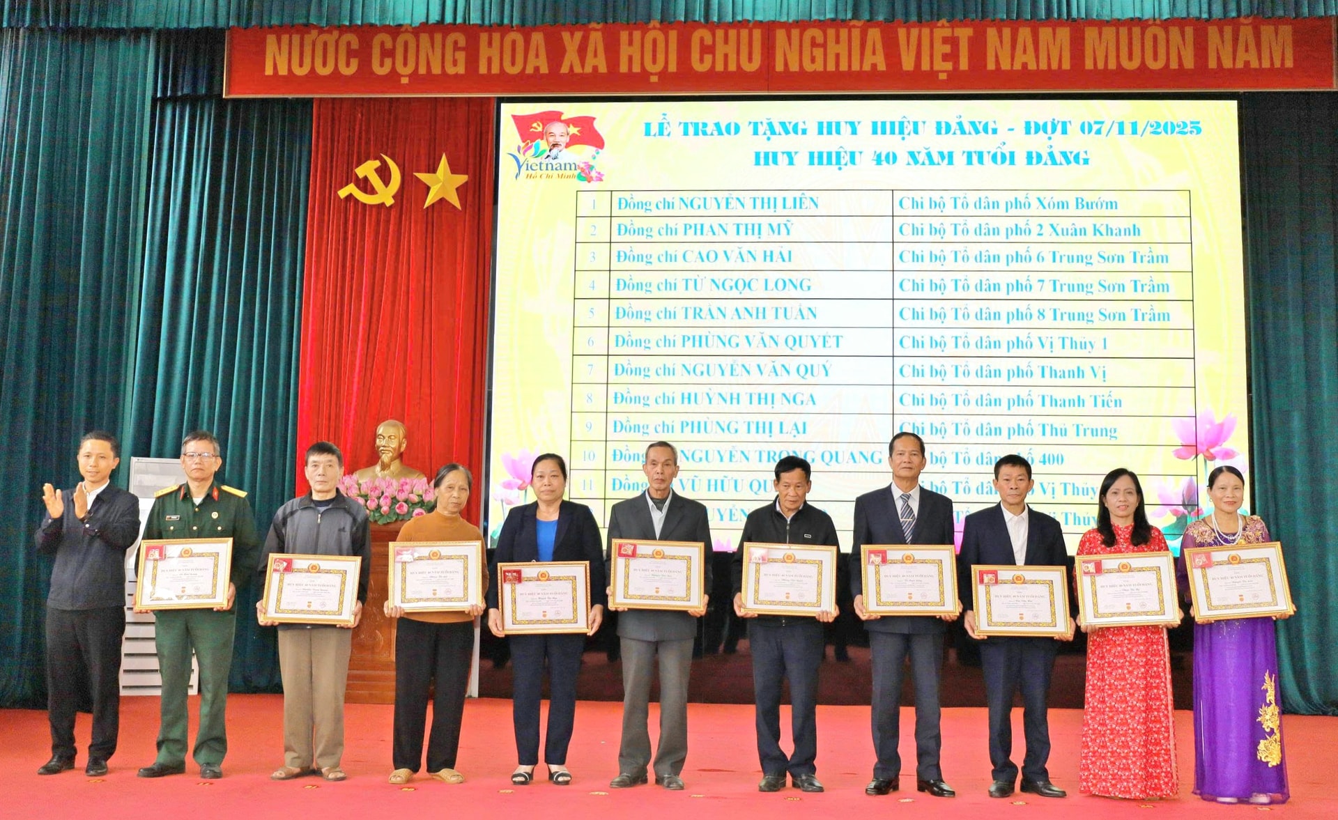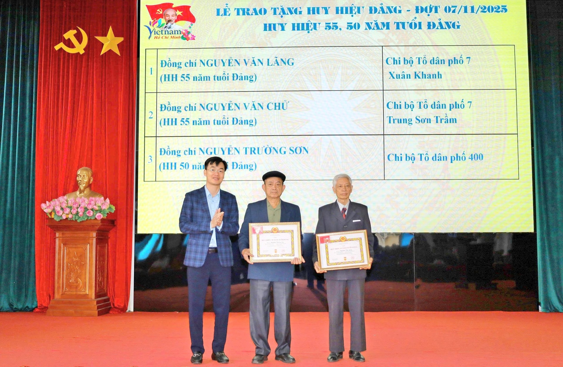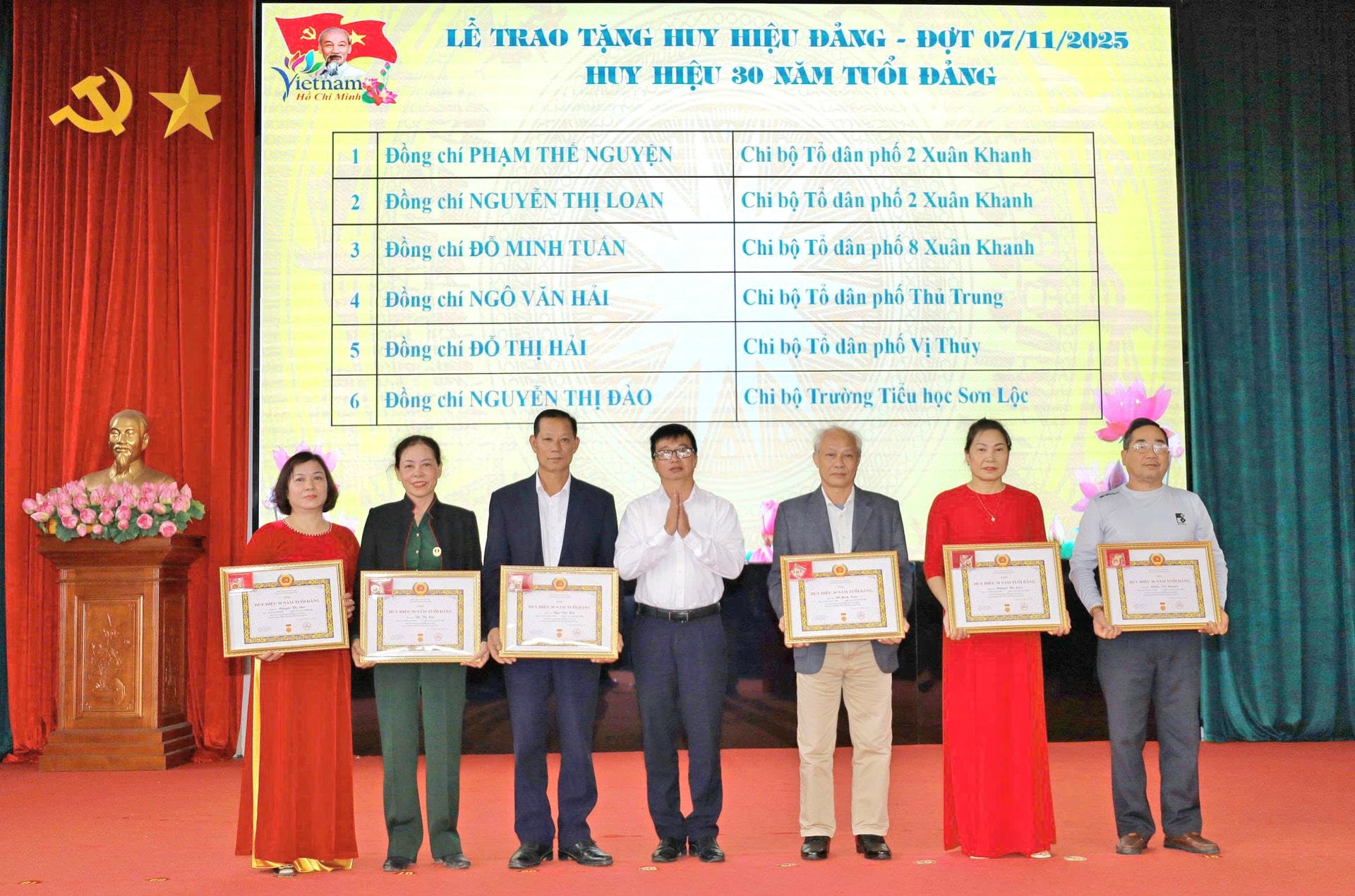 Đợt này, Đảng bộ phường Tùng Thiện có 38 đảng viên vinh dự được trao tặng và truy tặng Huy hiệu Đảng, trong đó có 4 đảng viên được nhận Huy hiệu 60 năm tuổi Đảng, 2 đảng viên nhận Huy hiệu 55 năm, 1 đảng viên nhận Huy hiệu 50 năm, 13 đảng viên nhận Huy hiệu 45 năm, 12 đảng viên nhận Huy hiệu 40 năm và 6 đảng viên nhận Huy hiệu 30 năm tuổi Đảng.