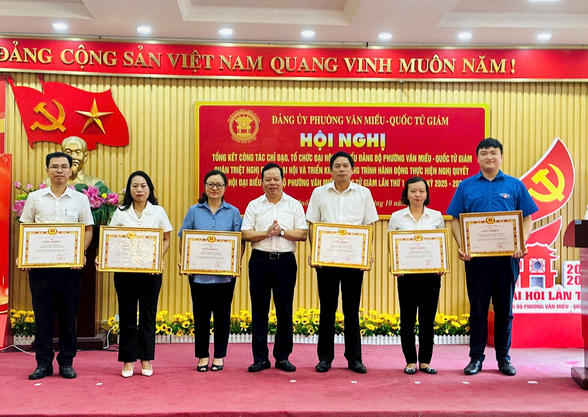Tại hội nghị, Đảng ủy phường Văn Miếu - Quốc Tử Giám đã khen thưởng 14 tập thể, 34 cá nhân có thành tích trong công tác tổ chức Đại hội đại biểu Đảng bộ phường Văn Miếu - Quốc Tử Giám lần thứ I, nhiệm kỳ 2025-2030.