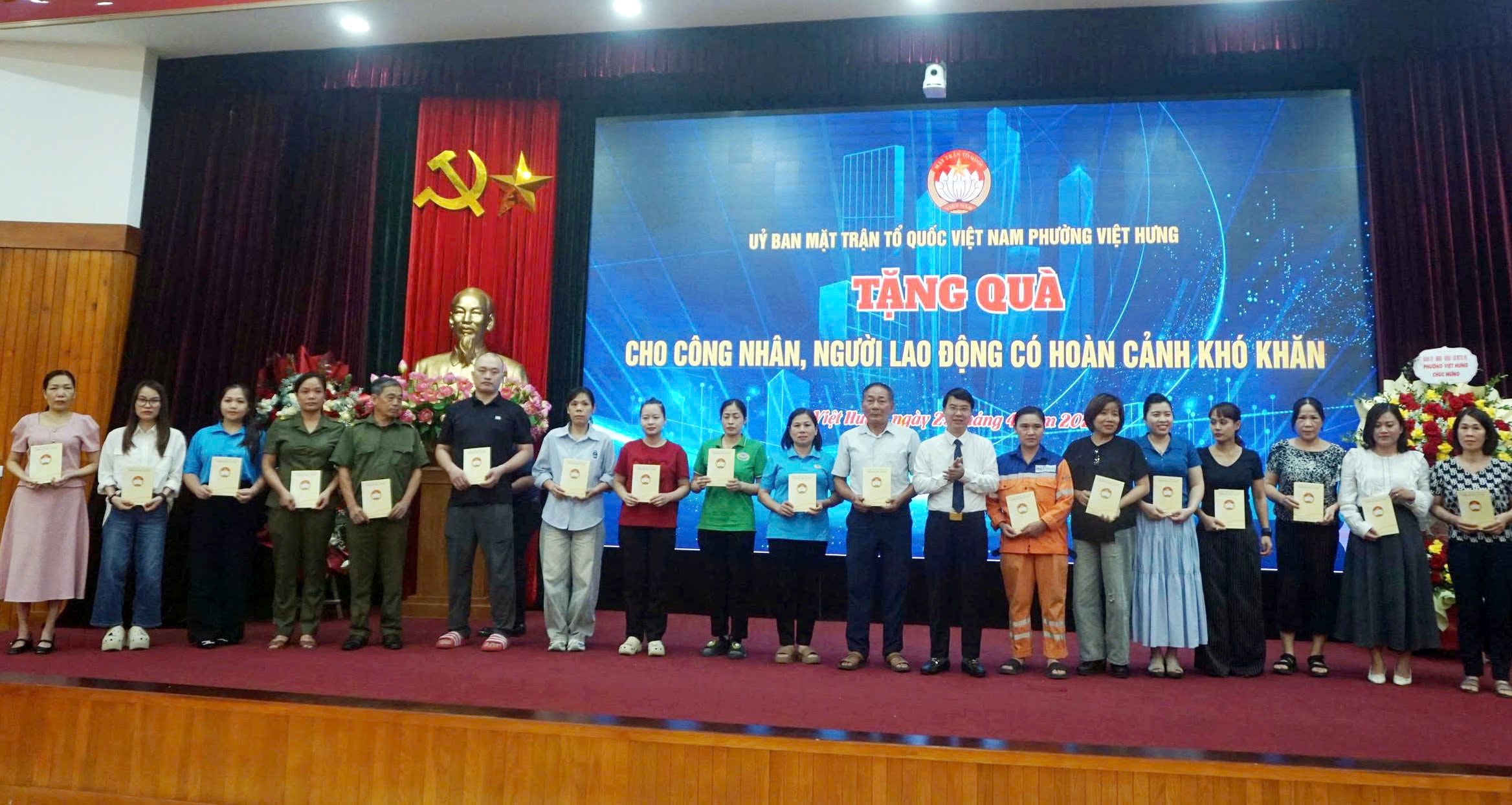 Lãnh đạo phường Việt Hưng trao quà cho công nhân, người lao động có hoàn cảnh khó khăn. Ảnh: B.Duy