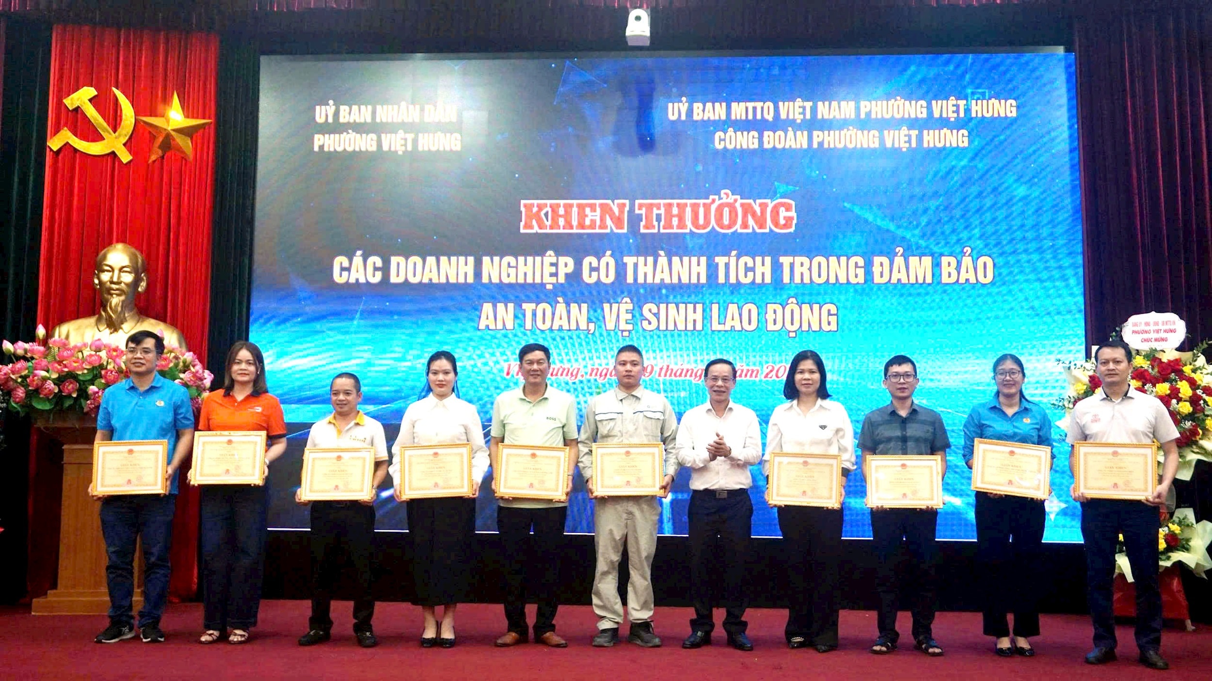 Nhân dịp này, UBND phường Việt Hưng đã trao Giấy khen cho 10 doanh nghiệp có thành tích tiêu biểu trong phong trào thi đua ATVSLĐ năm 2025 và 10 cá nhân là công nhân, người lao động giỏi năm 2025.