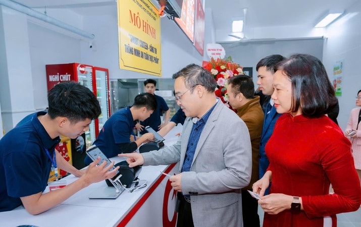 Chủ tịch UBND phường Việt Hưng Vũ Xuân Trường và Ban Giám hiệu Trường THCS Lý Sơn trải nghiệm mô hình Smart Canteen. Ảnh: PV