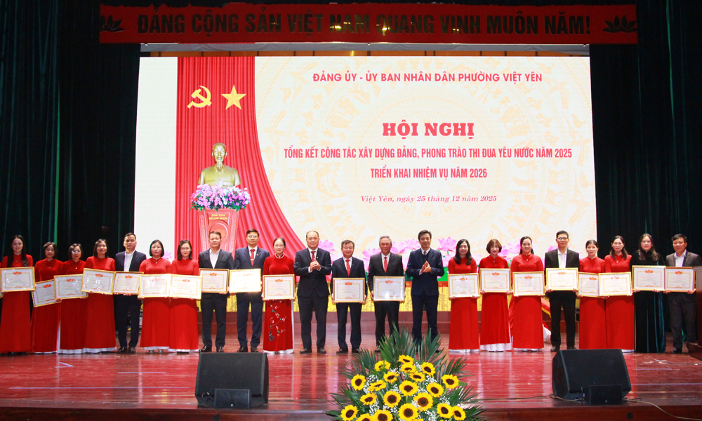 Tại hội nghị, Đảng ủy phường Việt Yên tặng Giấy khen cho 6 tập thể, 8 cá nhân hoàn thành xuất nhiệm vụ 5 năm (2021 - 2025); Chủ tịch UBND phường tặng danh hiệu Lao động tiên tiến cho 6 tập thể và danh hiệu Chiến sĩ thi đua cơ sở năm 2025 cho 24 cá nhân; tặng Giấy khen cho 18 tập thể, 33 cá nhân có thành tích xuất sắc trong phong trào thi đua yêu nước năm 2025.