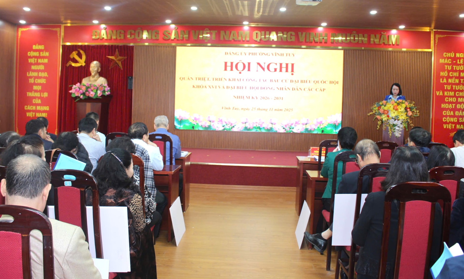 Phát biểu tại hội nghị, Phó Bí thư Thường trực Đảng ủy phường Vĩnh TuyPhùng Bích Nga cho biết, cuộc bầu cử đại biểu Quốc hội khóa XVI và đại biểu HĐND các cấp nhiệm kỳ 2026-2031 là sự kiện chính trị trọng đại của đất nước, Thủ đô và của phường. Cuộc bầu cử diễn ra đúng dịp kỷ niệm 80 năm Ngày Tổng tuyển cử đầu tiên, tiếp nối mạch nguồn dân chủ của đất nước. Thành công của cuộc bầu cử sẽ tạo bước khởi đầu quan trọng cho việc xây dựng, kiện toàn bộ máy Nhà nước và chính quyền các cấp, trong đó có phường Vĩnh Tuy trong nhiệm kỳ mới, tạo nền tảng chính trị - xã hội vững chắc để triển khai thắng lợi nghị quyết đại hội Đảng các cấp.