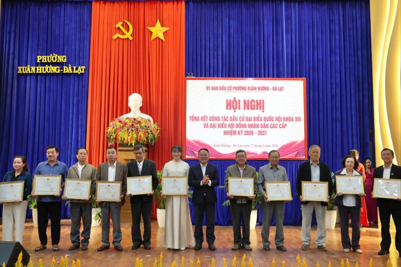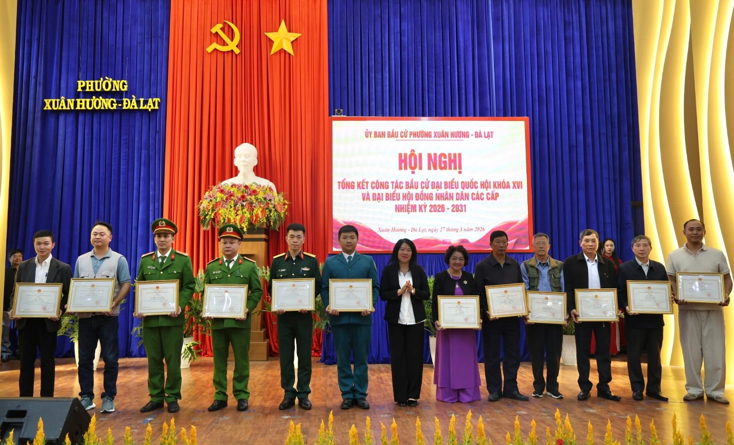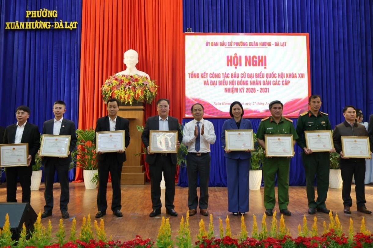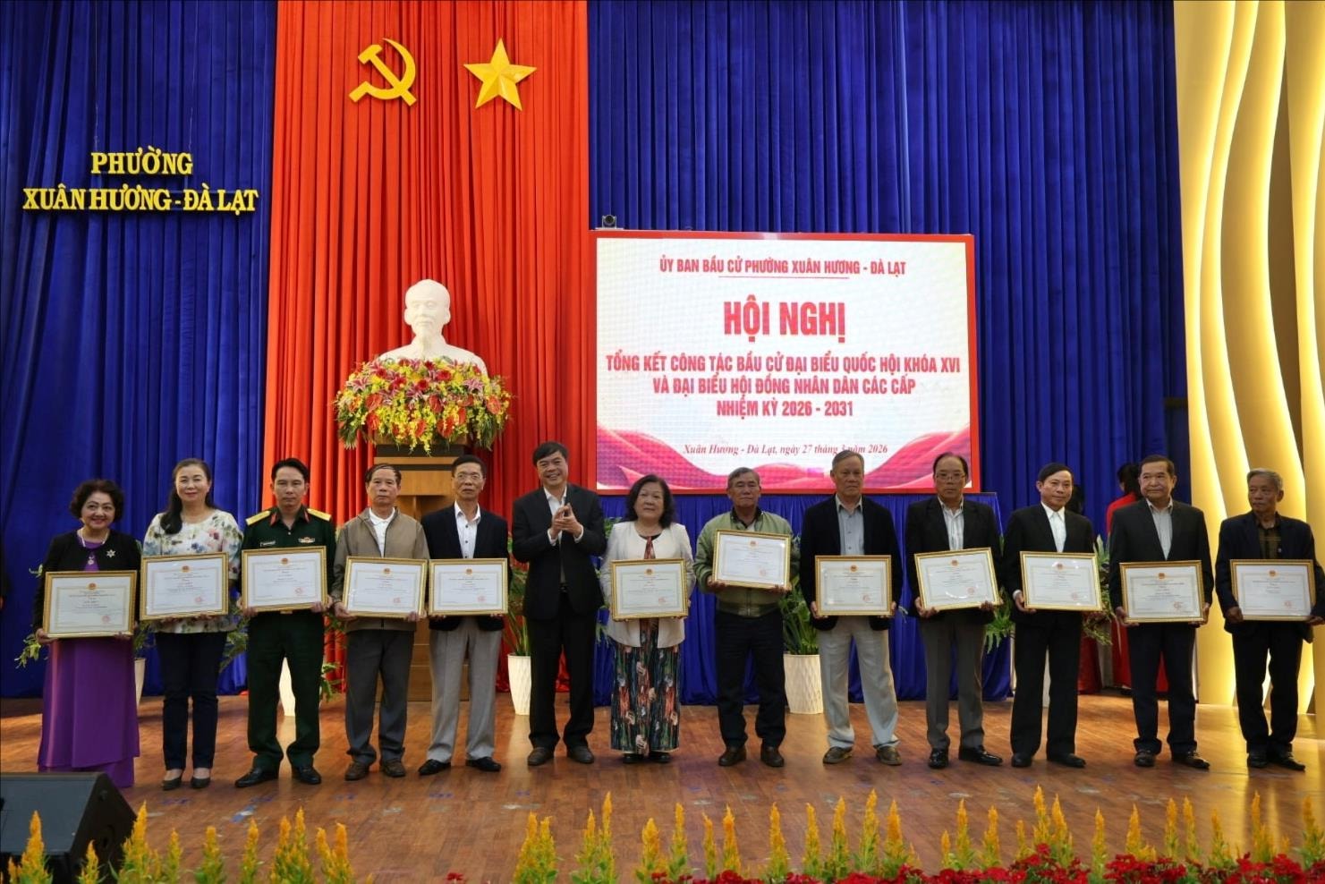 Dịp này, UBND phường Xuân Hương - Đà Lạt đã công bố quyết định và trao Giấy khen cho 21 tập thể và 49 cá nhân có thành tích xuất sắc trong đợt thi đua cao điểm tổ chức bầu cử.
