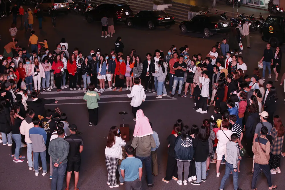 Các bạn trẻ với hoạt động văn nghệ tại khu vực phố đi bộ Hòa Bình, khu trung tâm Đà Lạt thời điểm hoạt động năm 2024