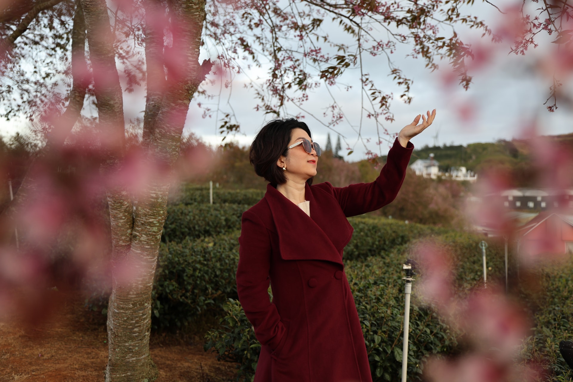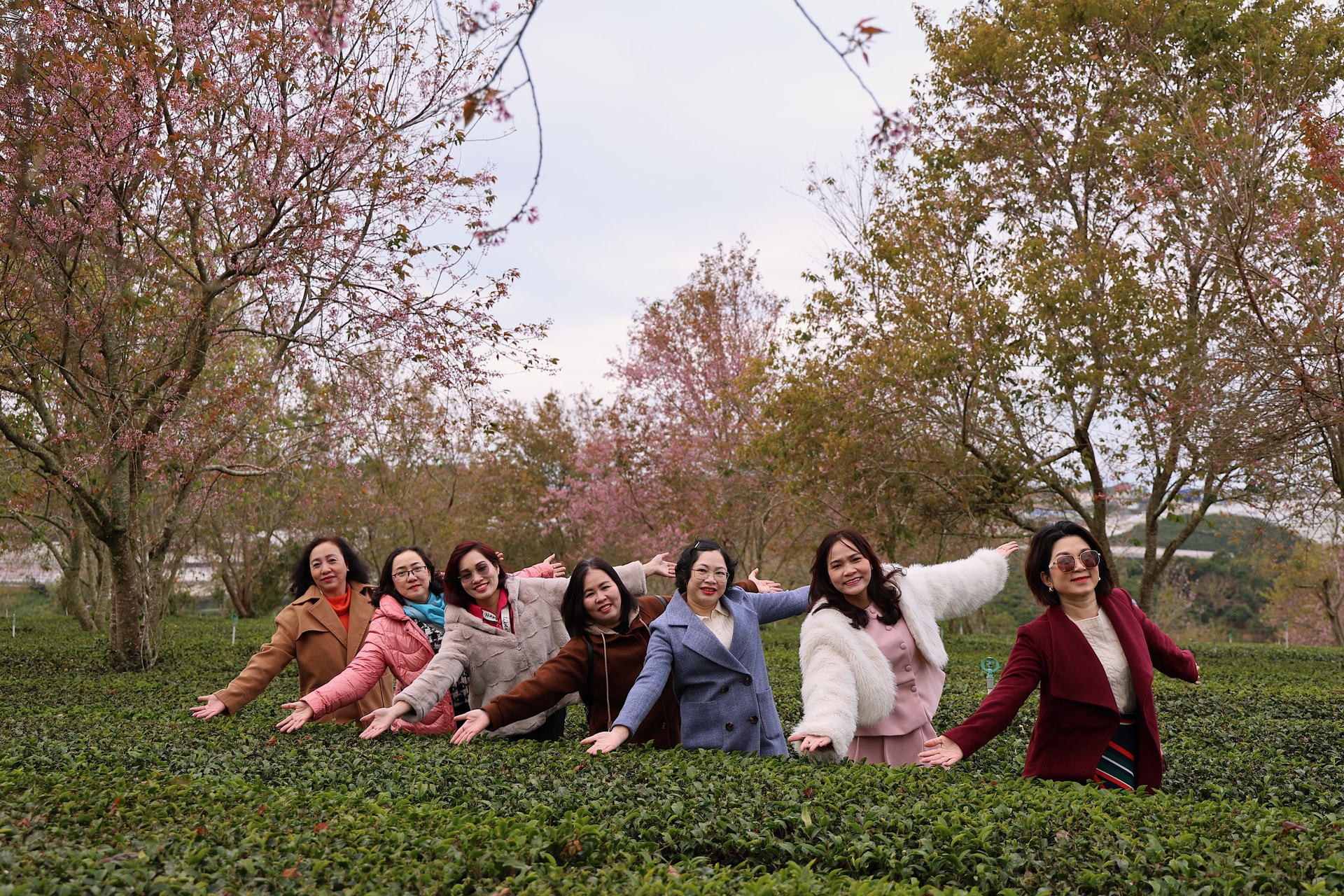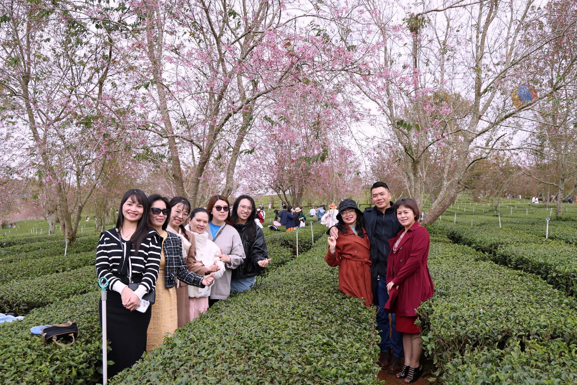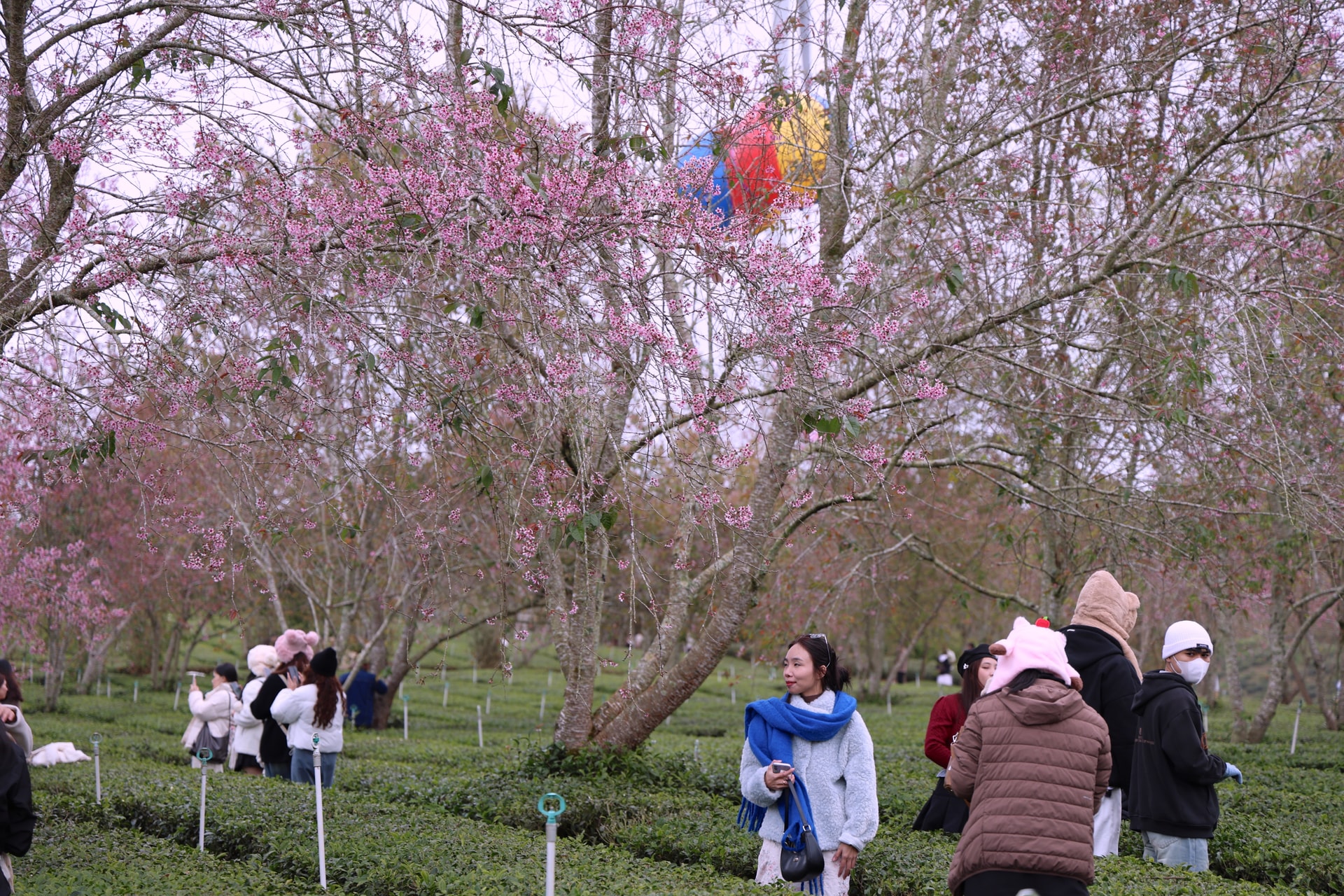 Sắc xanh đồi chè hòa cùng sắc hồng hoa mai anh đào tạo nên không gian trải nghiệm ấn tượng cho nhiều du khách