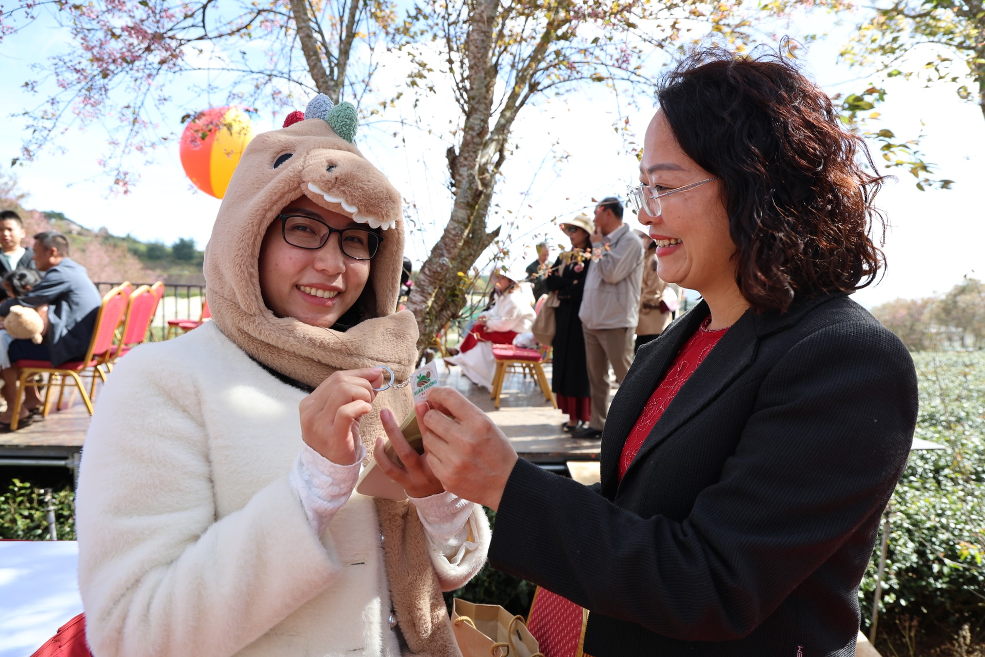 Du khách nhận quà lưu niệm và chia sẻ cảm xúc về vẻ đẹp hoa Mai Anh Đào Đà Lạt.