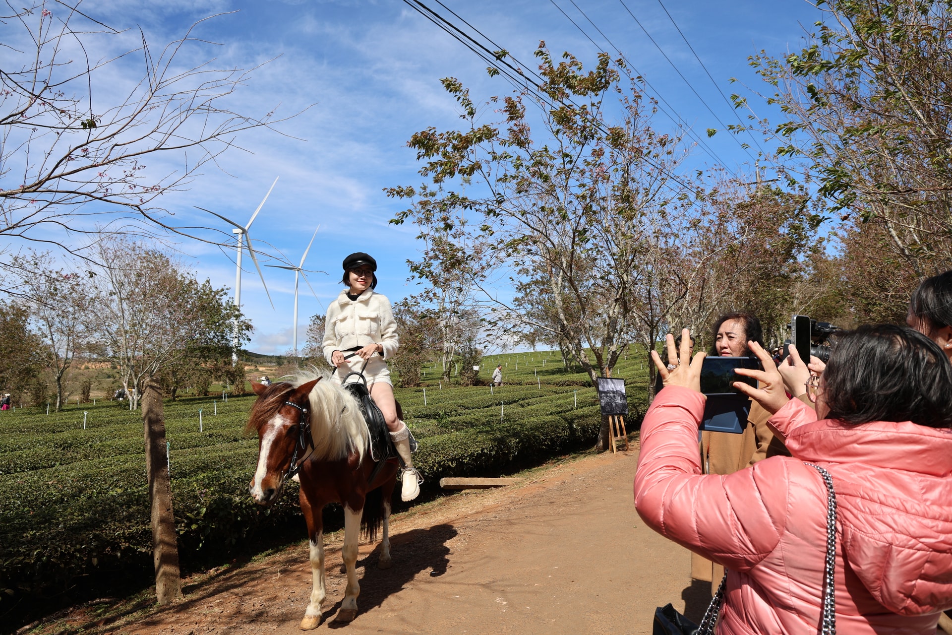 Du khách thích thú chụp ảnh lưu niệm cùng ngựa tại không gian đồi trà Cầu Đất, phường Xuân Trường - Đà Lạt