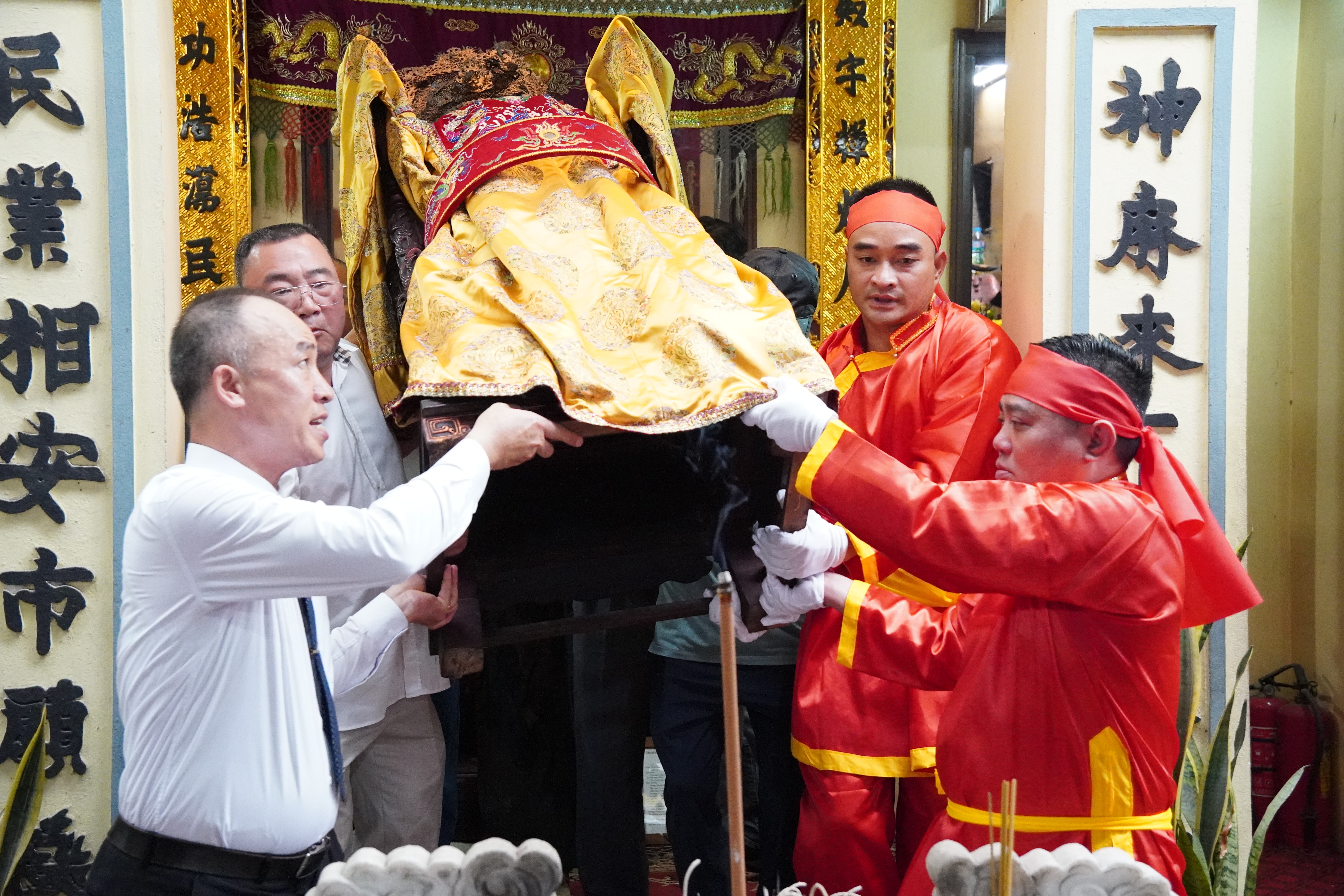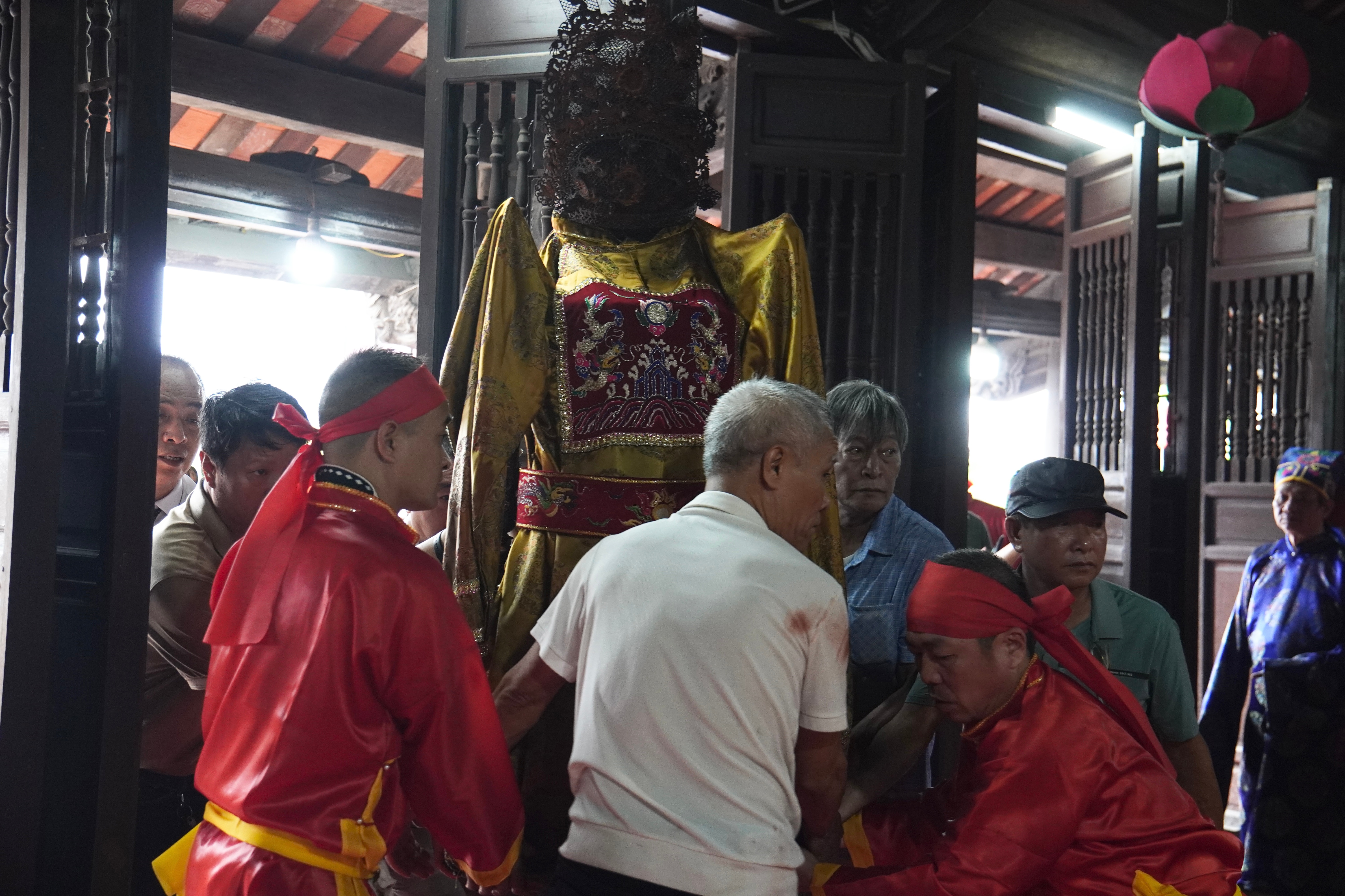 Theo tìm hiểu của phóng viên, mỗi chiếc kiệu nặng khoảng 100kg, được 24 thanh niên trai tráng khỏe mạnh nhất trong làng cùng khiêng trên vai.