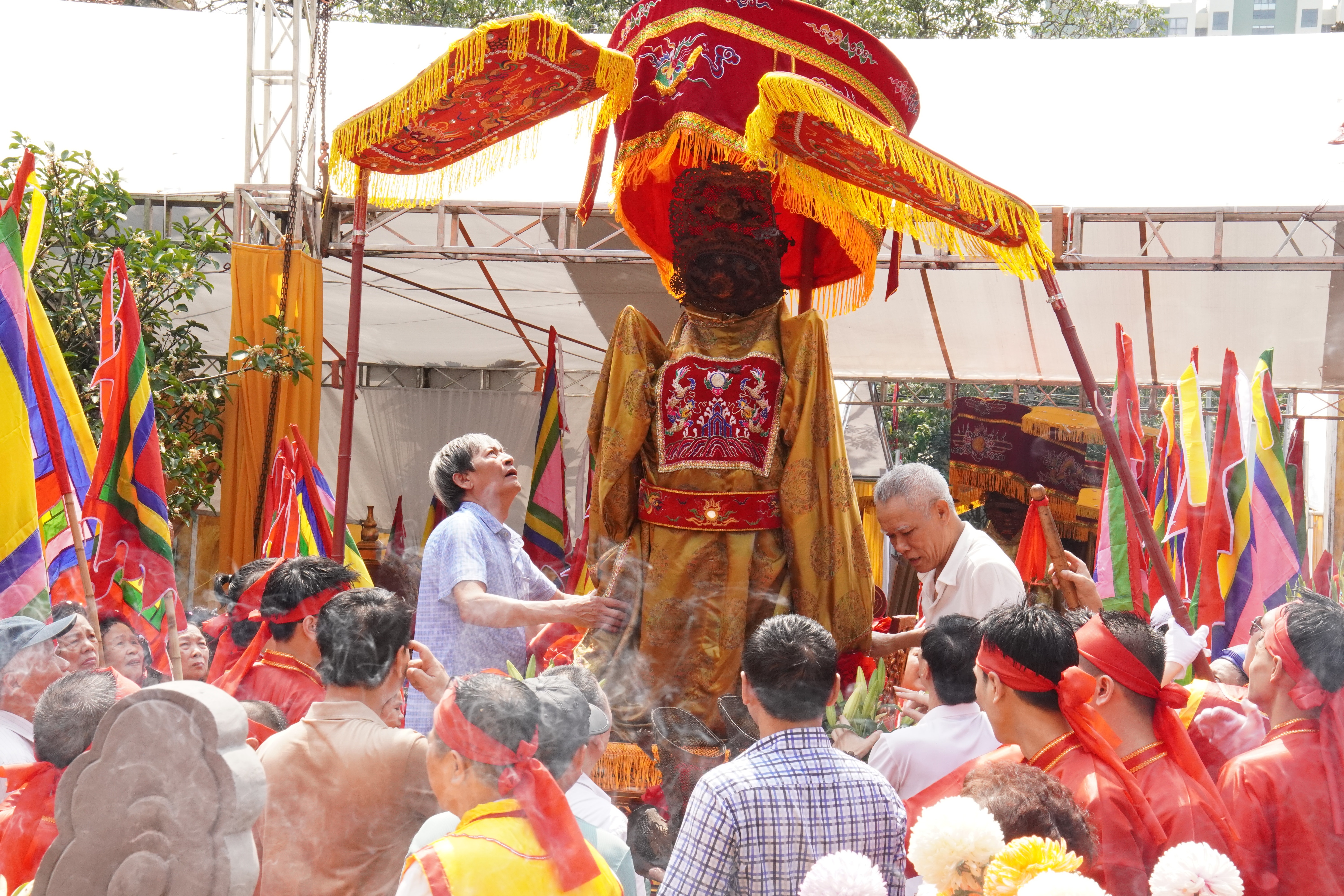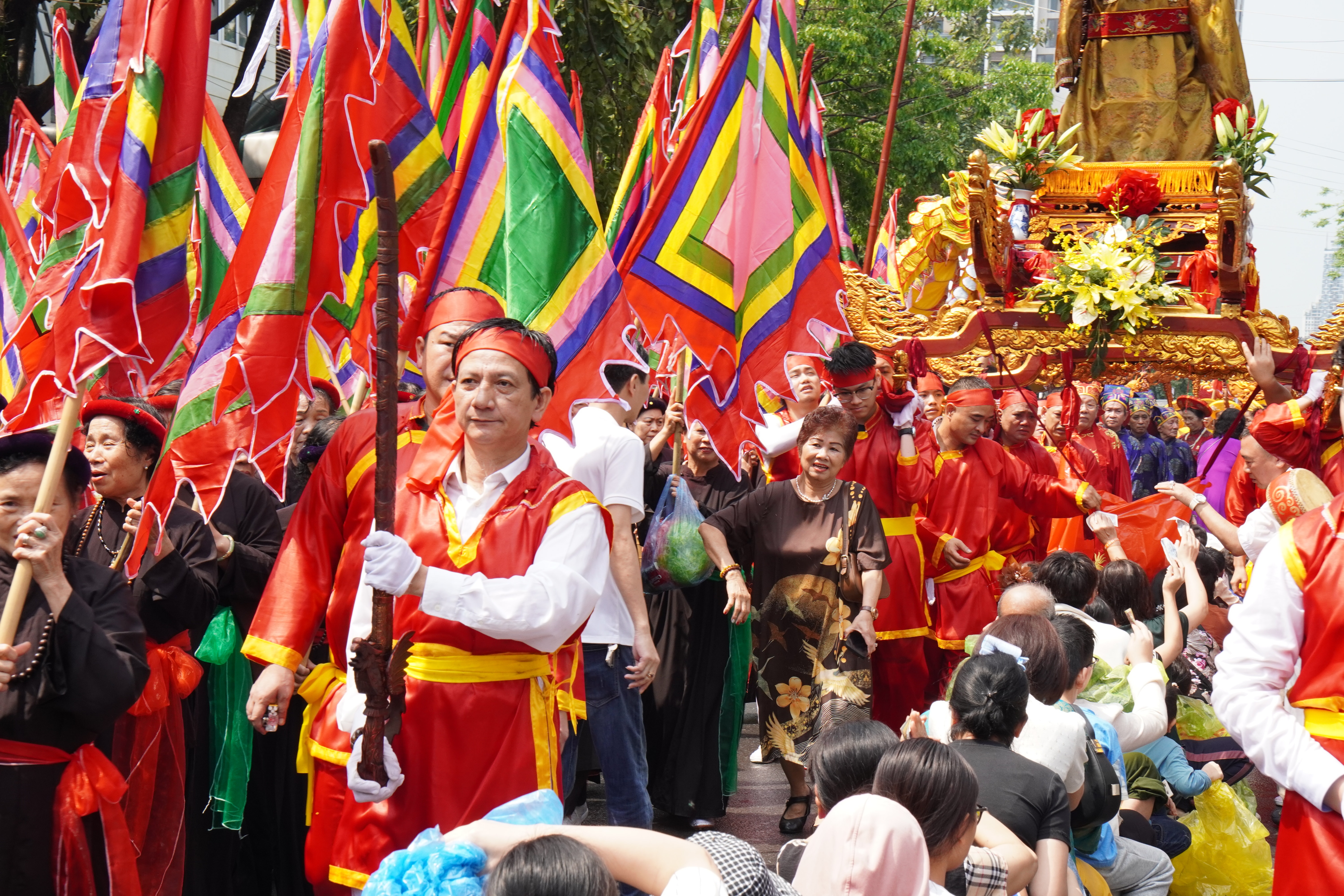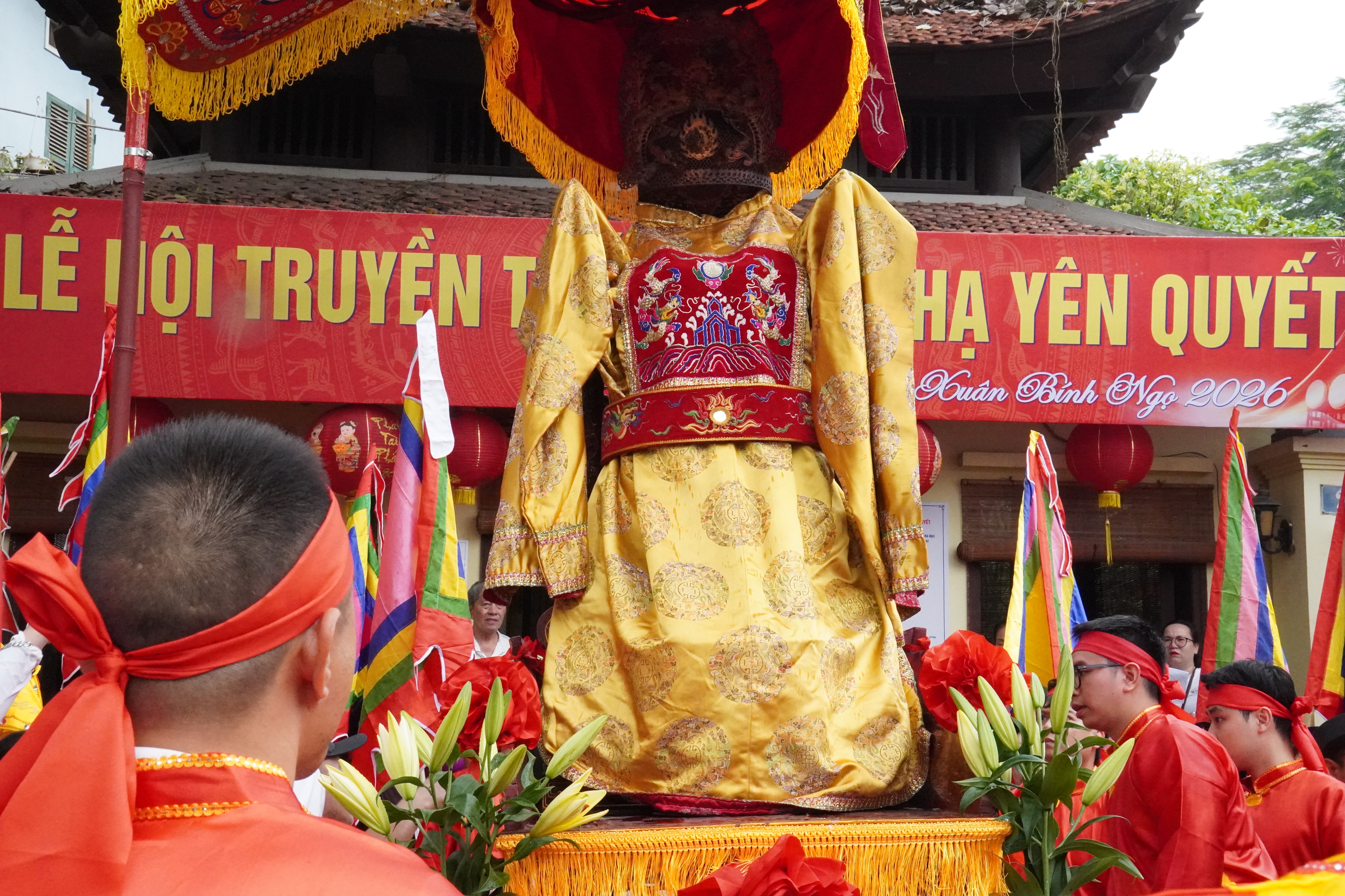 Các tuyến đường được trang hoàng cờ hội, đèn lồng rực rỡ, hòa cùng pano, khẩu hiệu tuyên truyền tạo nên diện mạo tươi mới, rộn ràng. Đông đảo Nhân dân địa phương và du khách thập phương đã có mặt để chứng kiến nghi thức rước kiệu – phần lễ được mong chờ nhất.