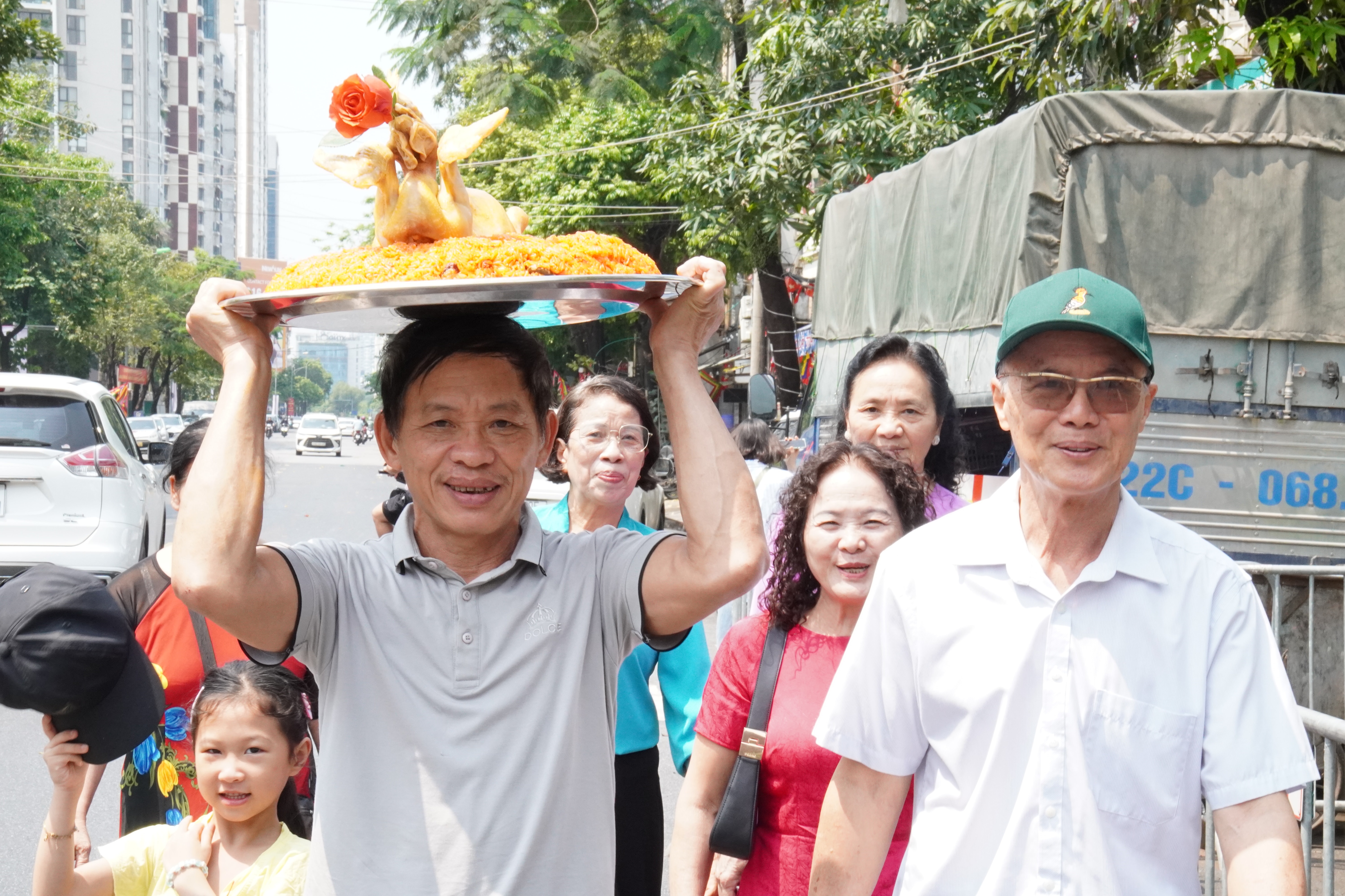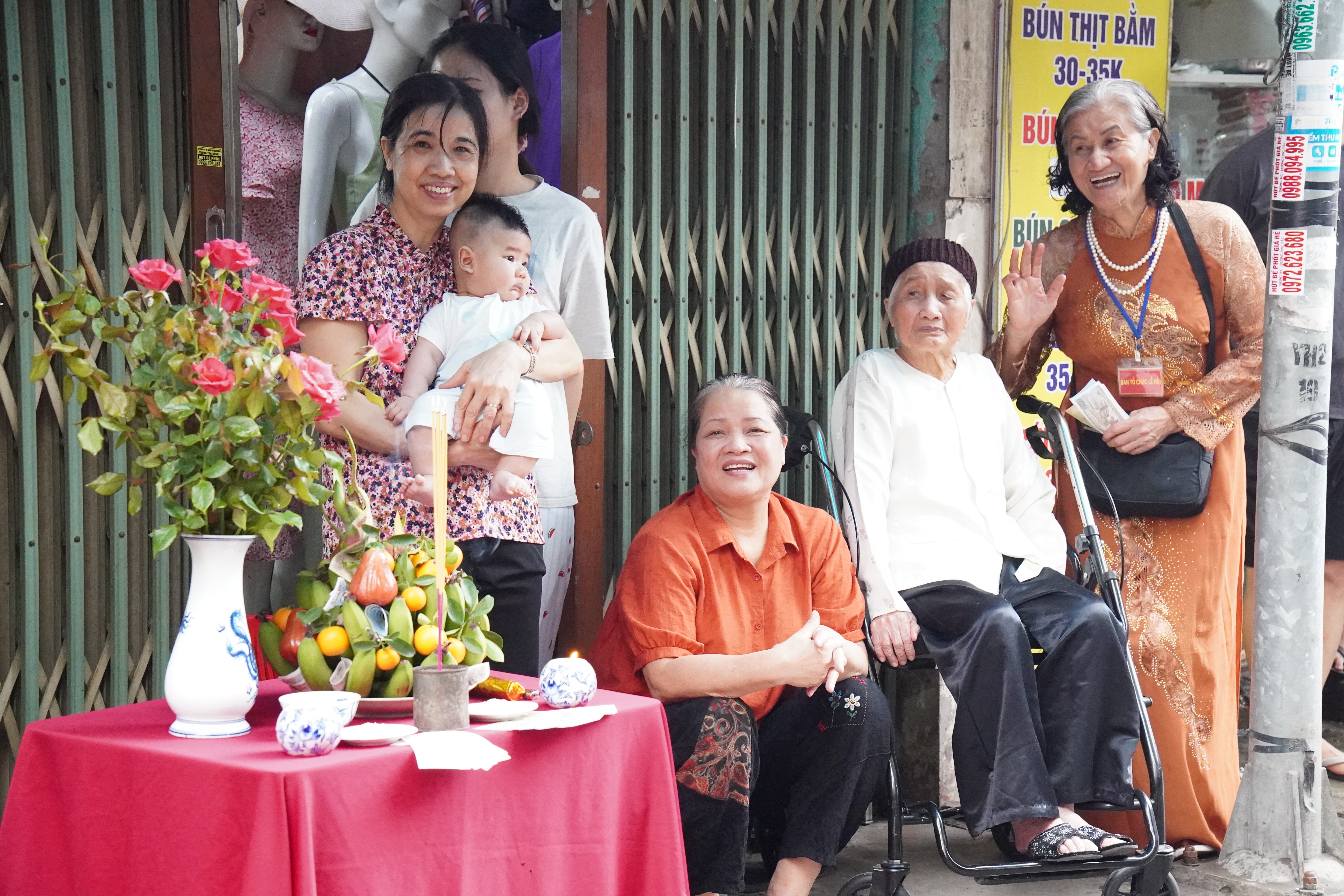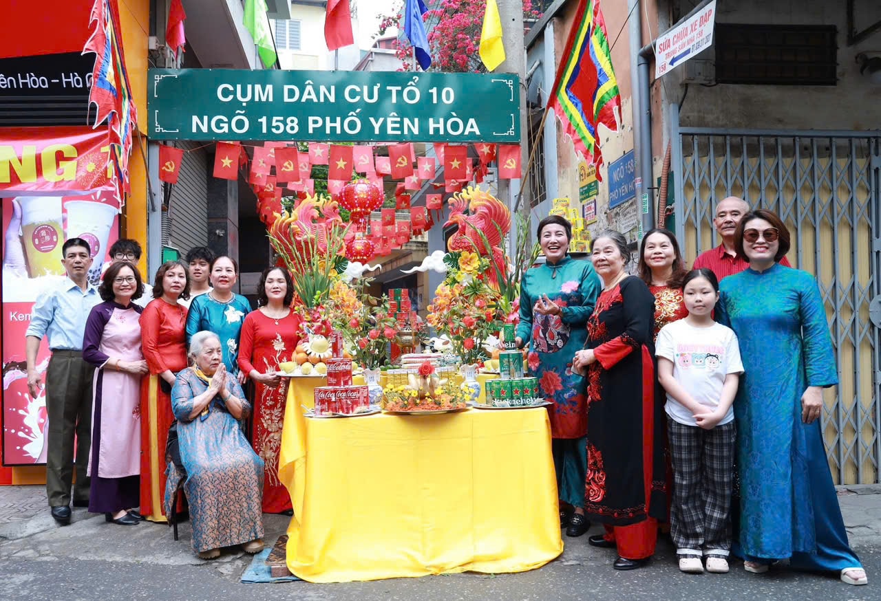 Cùng chung tâm trạng háo hức, từ tờ mờ sáng, người dân ngõ 158 phố Yên Hòa đã tất bật chuẩn bị mâm lễ. Người sắp tháp lễ, người bày biện hoa quả, xôi, gà… tất cả đều được chăm chút cẩn thận. Với họ, đây không chỉ là một nghi thức thường niên năm năm một lần, mà còn là dịp để gửi gắm lòng thành, cầu mong một năm bình an, thuận lợi.
