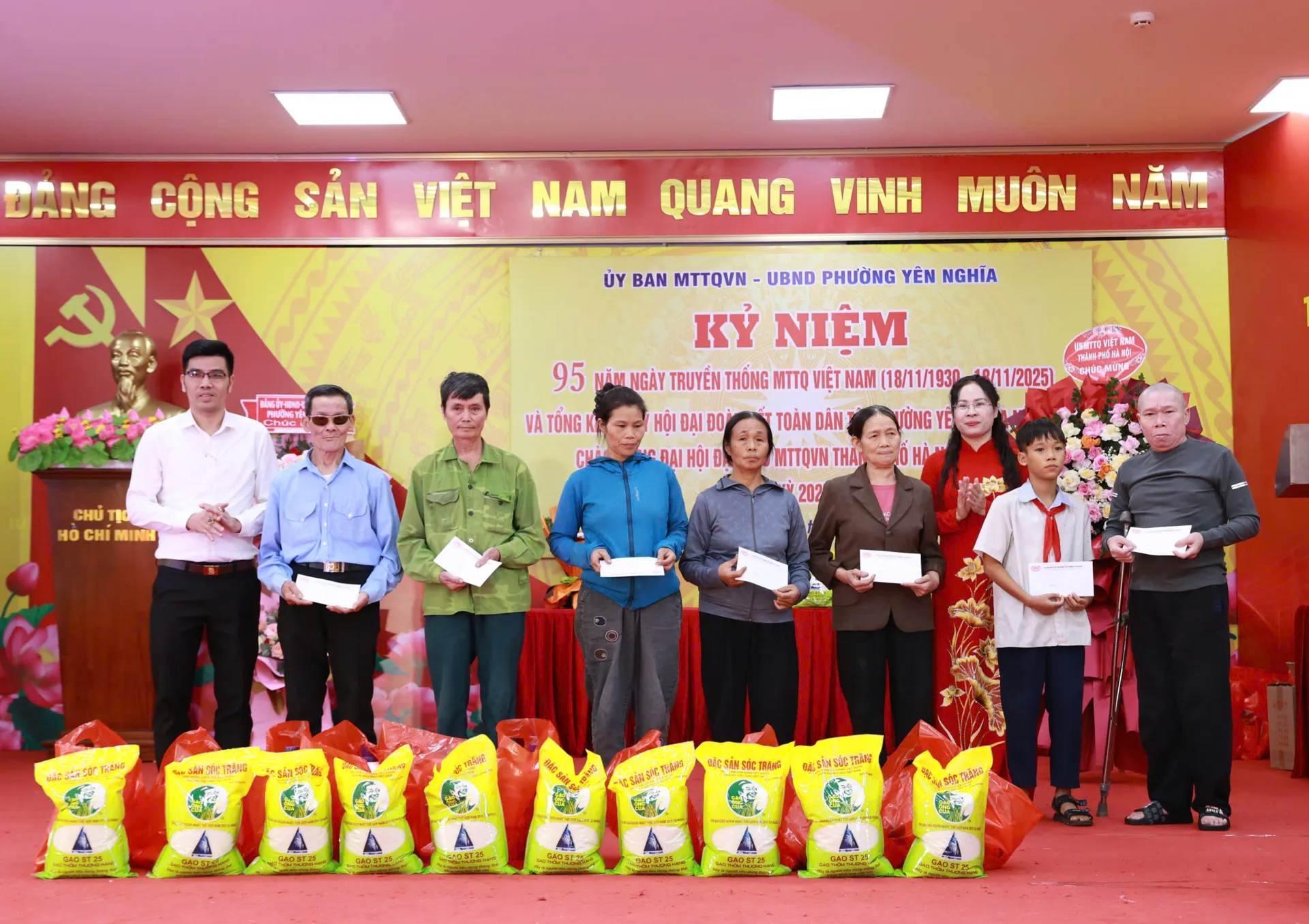 Nhân dịp này,Đảng ủy,HĐND, UBND, Ủy ban MTTQ Việt Nam phường Yên Nghĩa đã trao 51 suất quà, mỗi suất trị giá 700.000 đồng, tặng các hộ gia đình có hoàn cảnh khó khăn và học sinh vượt khó, đạt thành tích cao trong học tập.