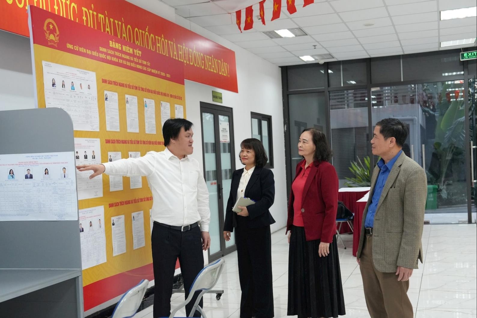 Chủ tịch UBND phường, Phó Chủ tịch Thường trực Ủy ban Bầu cử phường Yên Sở Vũ Tuấn Đạt (ngoài cùng bên phải) trực tiếp kiểm tra công tác chuẩn bị tại các điểm bỏ phiếu. Ảnh: Minh Đức