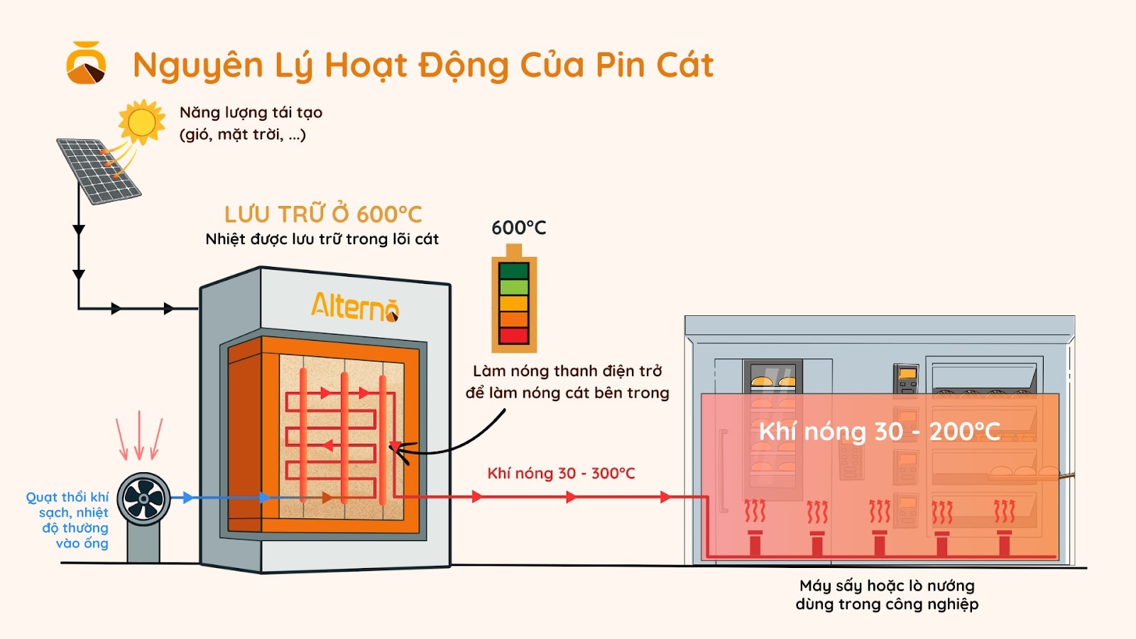 Công nghệ lưu trữ nhiệt bằng cát của Alternō hướng tới việc cung cấp nguồn nhiệt ổn định cho các ngành công nghiệp như chế biến nông sản và sản xuất, với chi phí cạnh tranh so với các phương thức truyền thống.