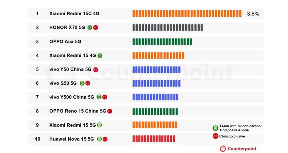 Dữ liệu về 10 điện thoại thông minh bán chạy nhất với dung lượng pin từ 6.000 mAh trở lên - Nguồn ảnh: Counterpoint Research