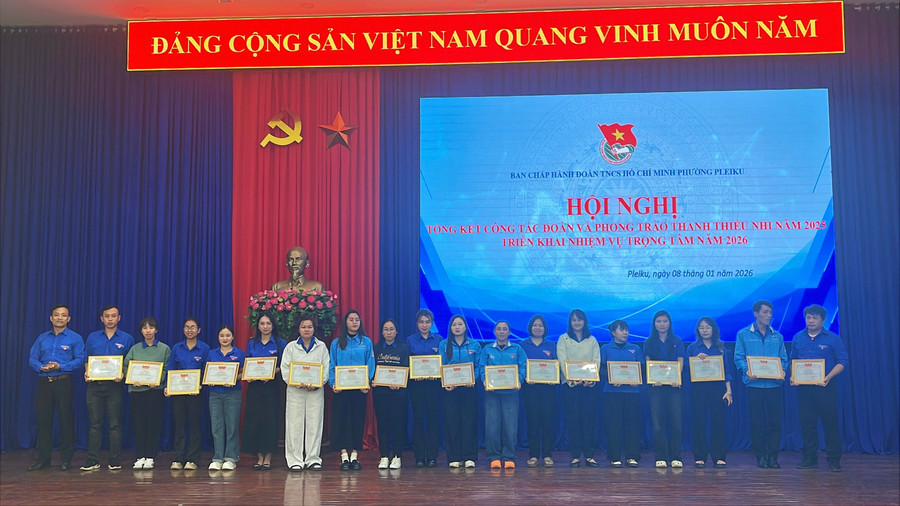 Dịp này, Ban Thường vụ Đoàn phường Pleiku đã khen thưởng cho 8 tập thể, 20 cá nhân có thành tích trong công tác Đoàn và phong trào thanh thiếu nhi năm 2025; đồng thời, khen thưởng 5 cá nhân có thành tích trong công tác nhận ủy thác Ngân hàng Chính sách xã hội phường Pleiku năm 2025.