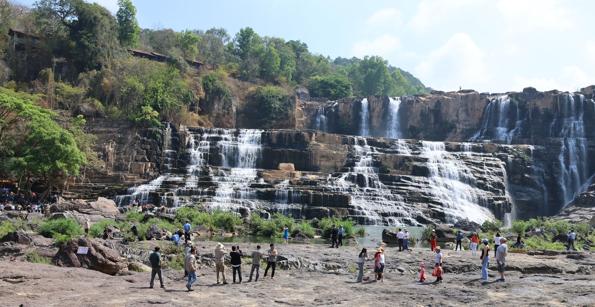 Du khách dạo chơi dưới chân thác Pongour