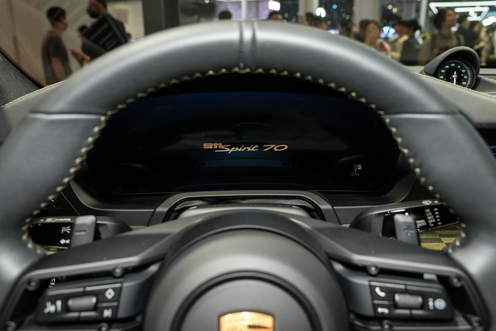 Porsche 911 Spirit 70 sử dụng cấu hình nội thất của phiên bản nâng cấp giữa vòng đời, bao gồm bảng đồng hồ taplo kỹ thuật số 12.6 inch và màn hình trung tâm 10.9 inch.
