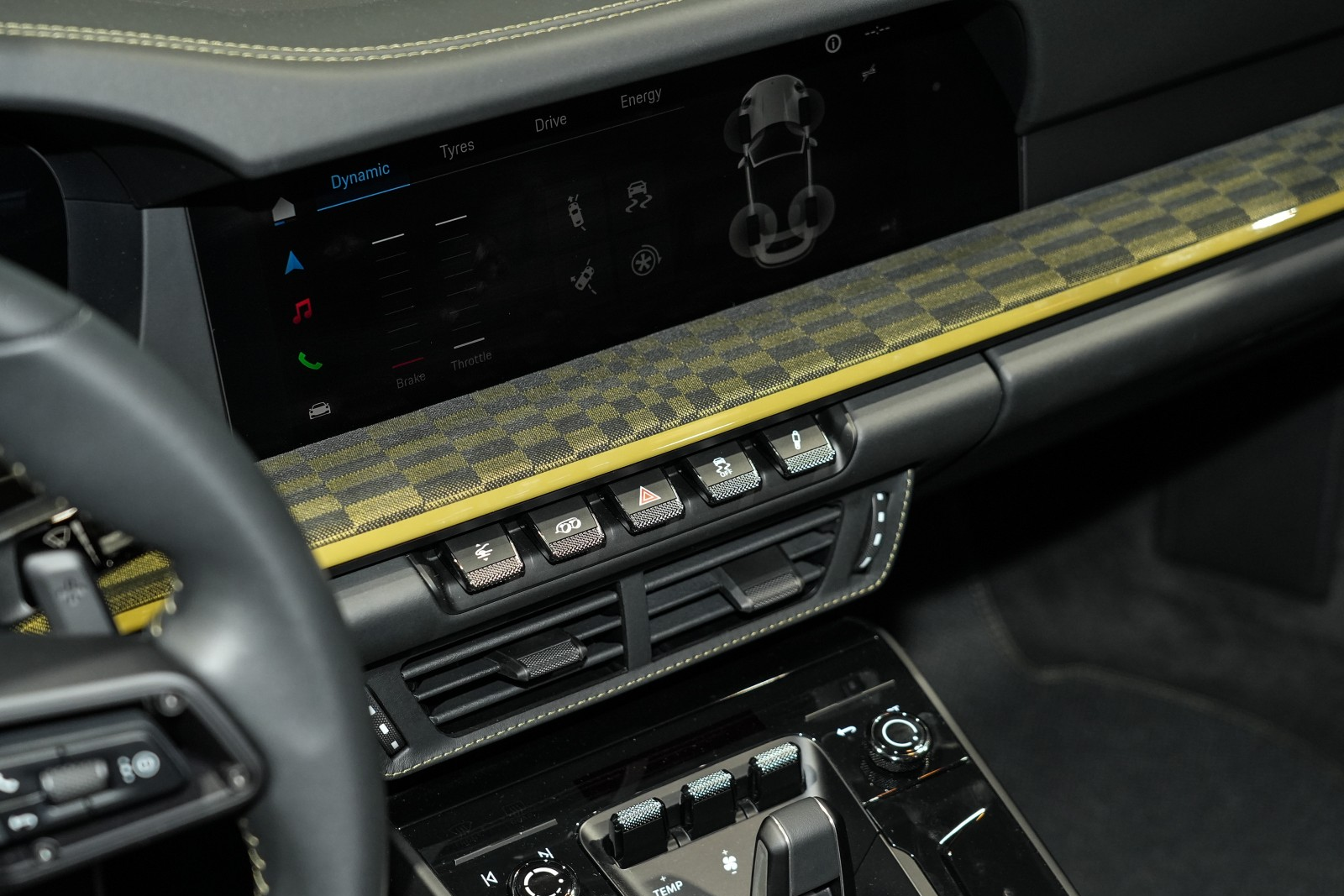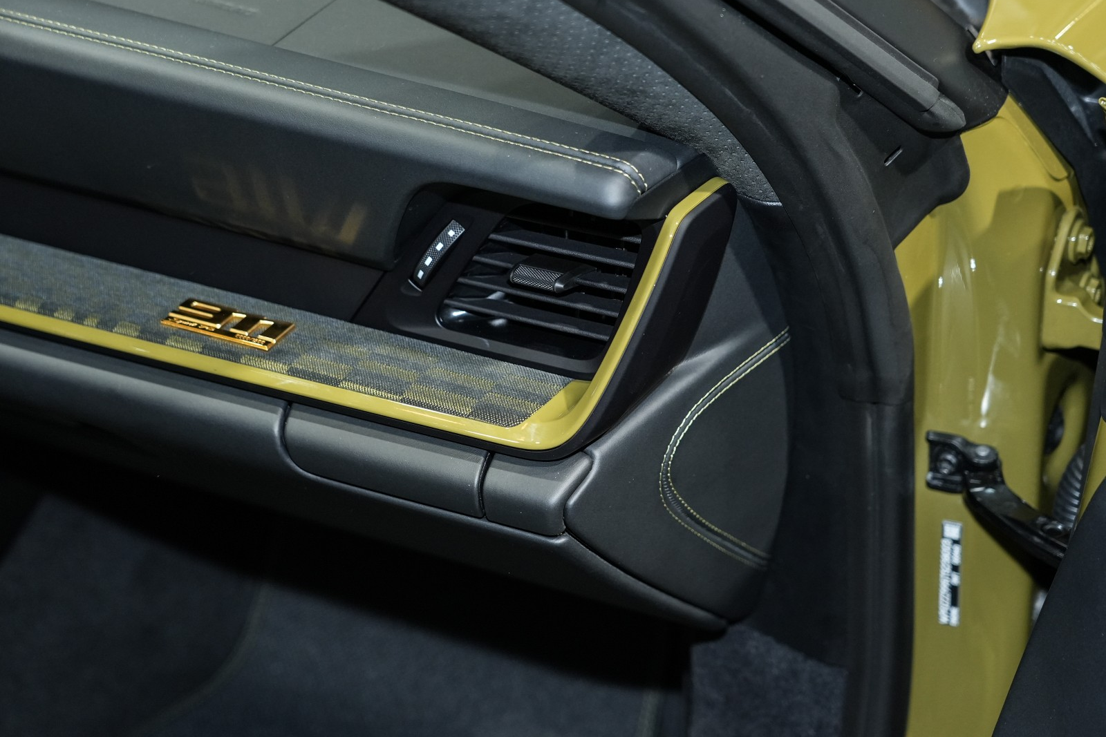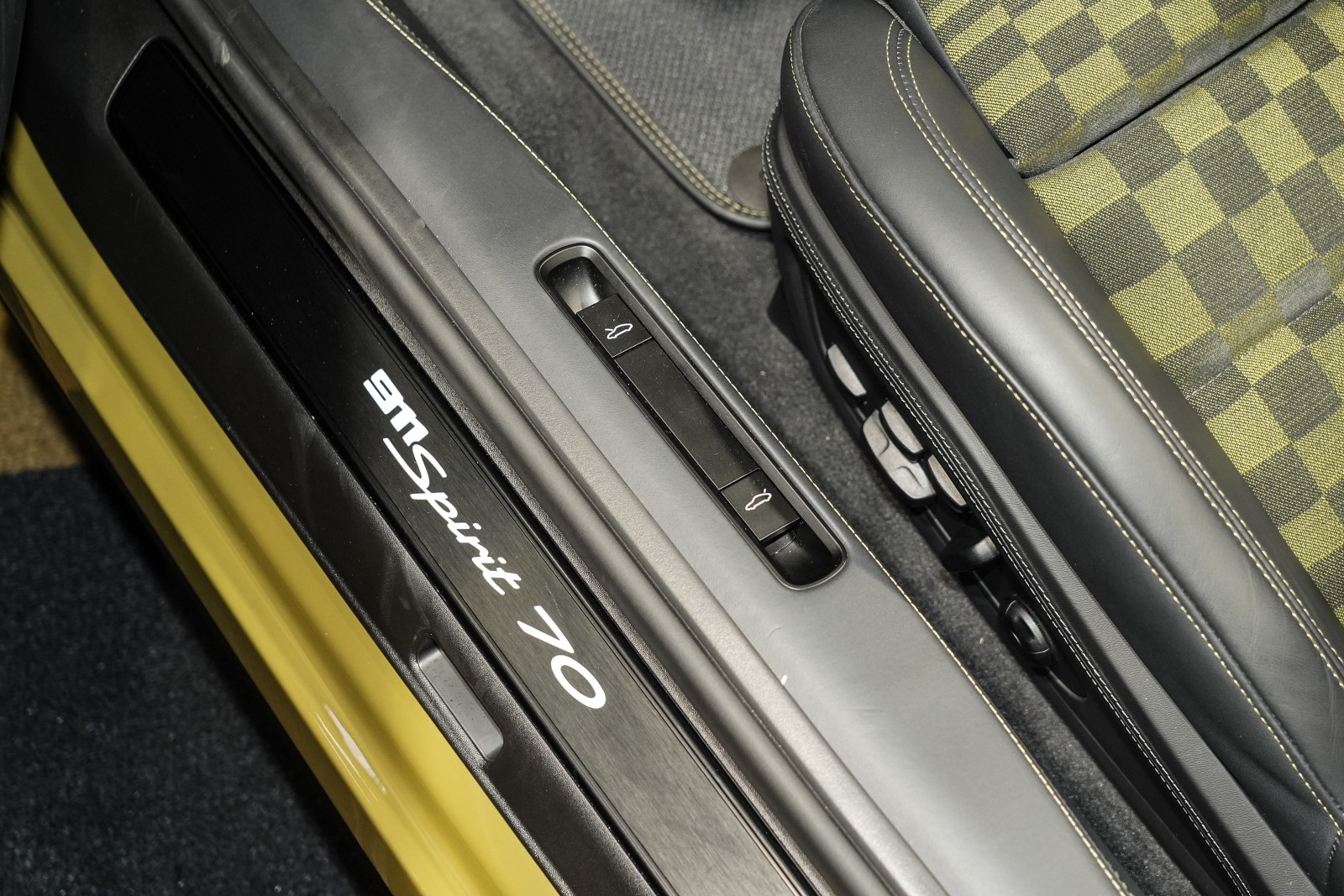 Huy hiệu 911 Spirit 70 cũng xuất hiện tại nhiều vị trí như bảng đồng hồ taplo, bệ ốp cửa... Bảng taplo cũng được trang trí với chất liệu vải caro đặc trưng và số thứ tự của từng xe.