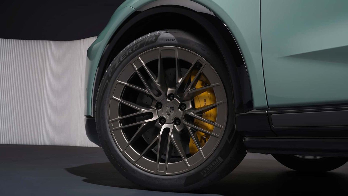 Điểm nhấn phía sau là dải đèn 3D cùng dòng chữ Porsche phát sáng. Phiên bản Cayenne Turbo Electric có thêm những chi tiết tương phản với màu xám Turbonite đặc trưng của Porsche.